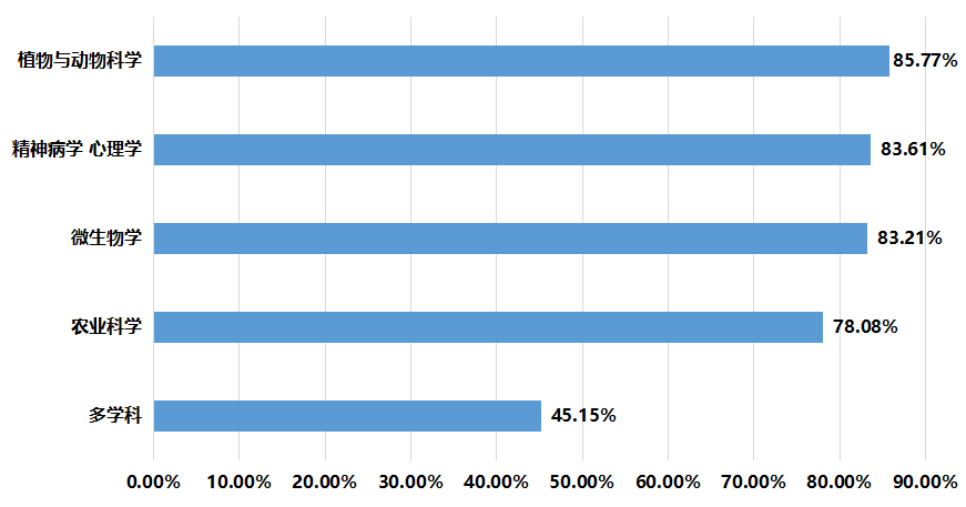 我校进入ESI世界前1%的16个学科中,工程学、材料科学、环境与生态学、临床医学和计算机科学进入世界前1‰。化学、生物与生化、地球科学、一般社会科学、药理学与毒理学和分子生物与遗传学进入世界前3‰。 我校未进入ESI前1%的学科接近程度(我校该学科被引频次/进入ESI前1%学科被引频次阈值)如下图所示。其中,植物与动物科学、精神病学 心理学、微生物学、农业科学、多学科均进步显著。 图:我校未进入ESI前1%的学科接近程度