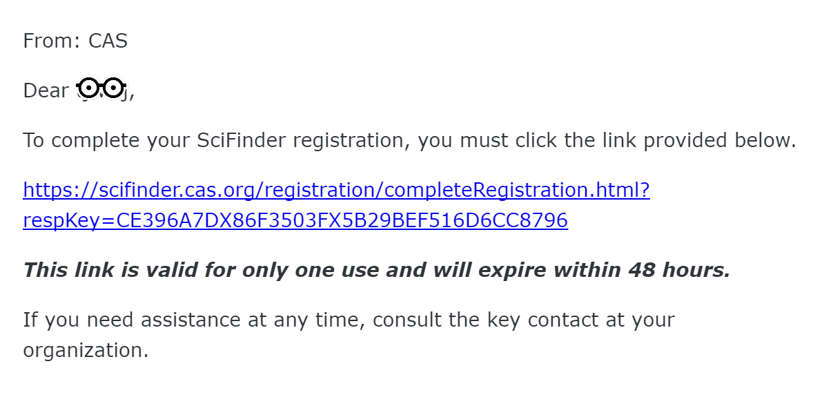 注册须知读者在首次使用CAS SciFindern之前须用同济大学的学校域名邮箱地址(学工号@tongji.edu.cn邮箱)注册账号。 如果您是同济新人,还没有学校邮箱,可点击学校邮箱页面“马上注册”,点击“学校邮箱”进行邮箱注册。 同济邮箱链接:https://mail.tongji.edu.cn/ 我校的SciFindern账号注册链接是: https://scifinder.cas.org/registration/index.html?corpKey=836155E6-86F3-50AB-6830-27266BA5A192 在注册页面上根据提示输入相应信息,需要注意的是,填写注册信息时,Last Name请填写“姓”的汉语拼音全拼,First Name请填写“名”的汉语拼音全拼。否则账号会快速失效。 另一个注意点是,您设置的登录数据库使用的用户名(Username)必须是唯一的,且包含5至15个字符。密码必须包含7至15个字符,并且包含以下字符: 在您提交完整的注册信息之后,系统将自动发送一个链接到您所填写的同济邮箱中,收到的邮件如图所示。 激活此链接即可完成注册。如果在您提交注册信息后30分钟内未收到来自CAS的邮件,请检查您的邮箱设置,仍然无法解决可以联系China@acs-i.org,或联系图书馆数据库负责人魏老师(021-65985849或wwj@lib.tongji.edu.cn)。 CAS SciFindern数据库网址:https://scifinder-n.cas.org/ 登录后界面如图所示,即可按需进行检索。 特别提示