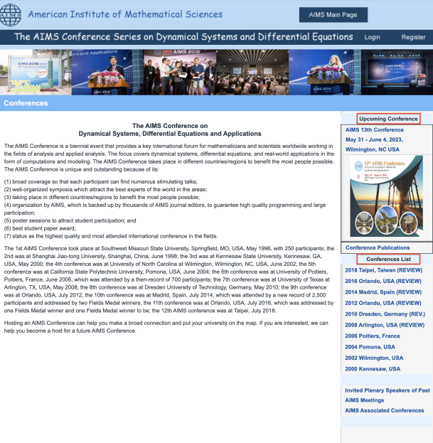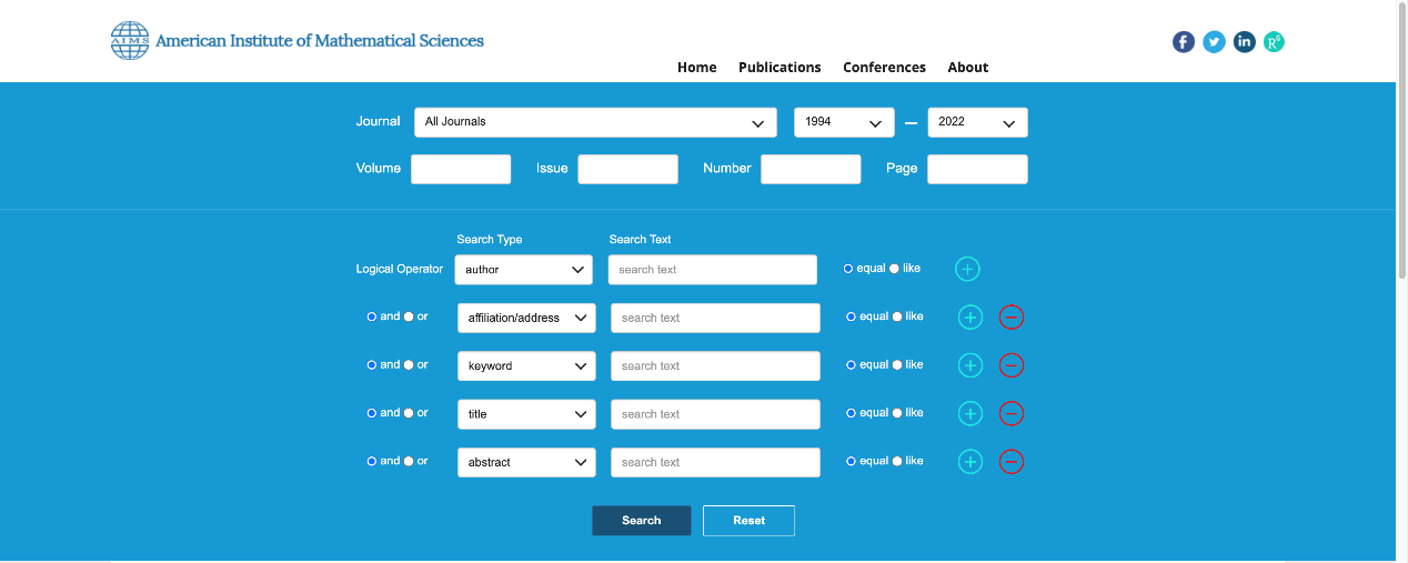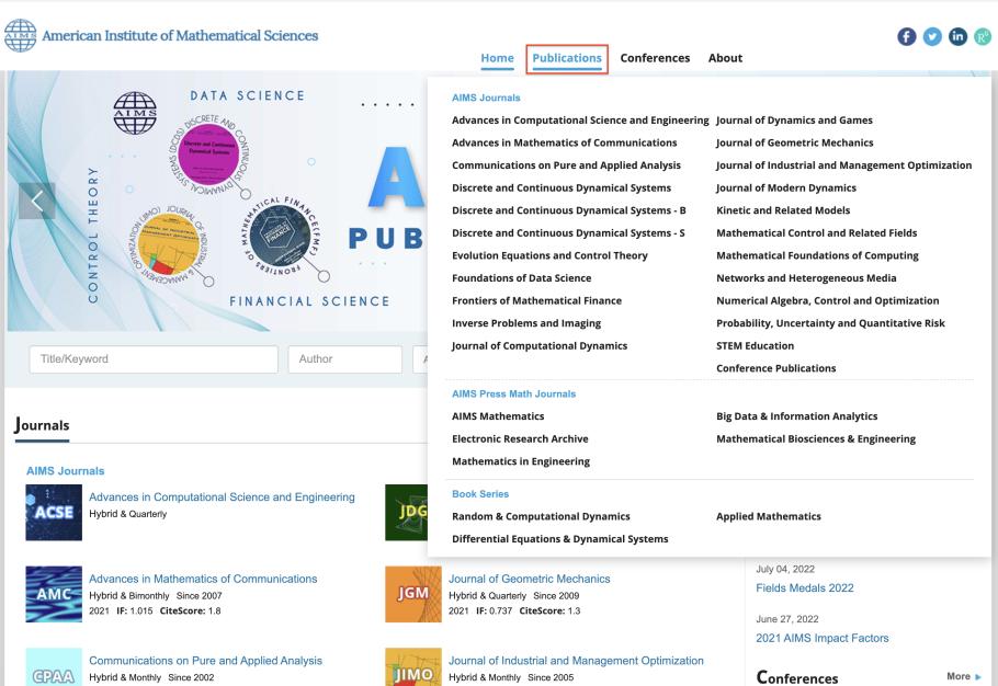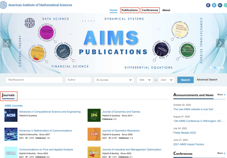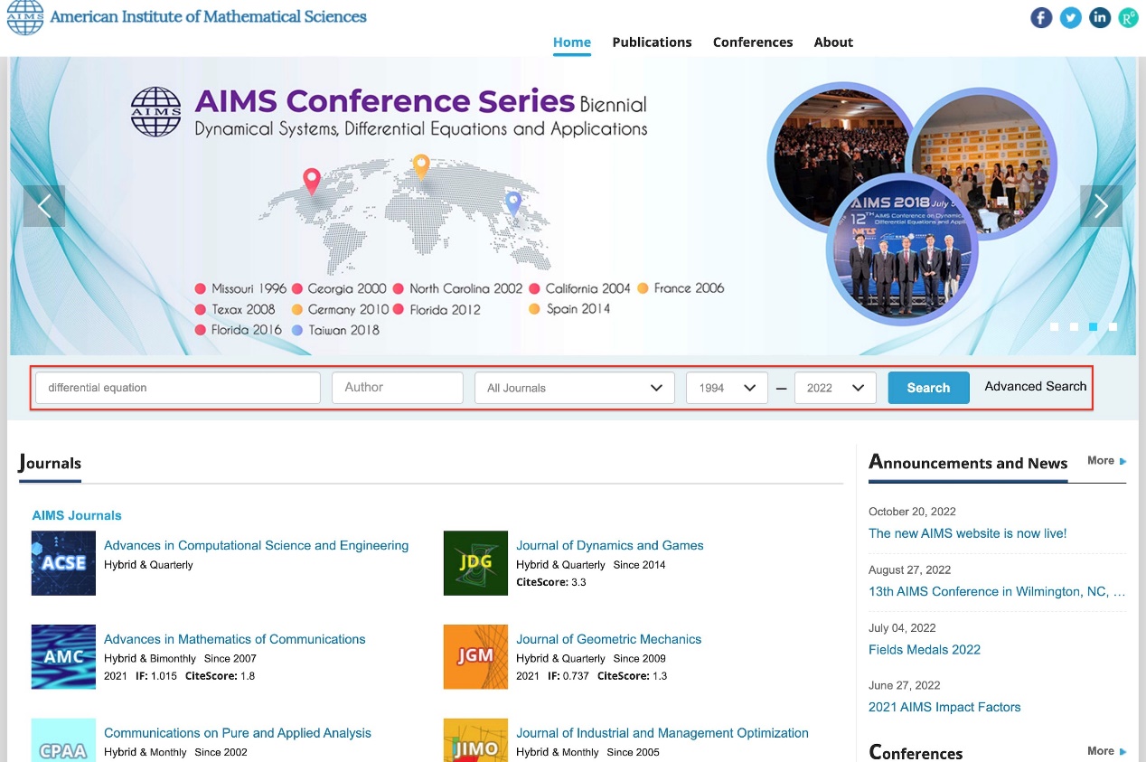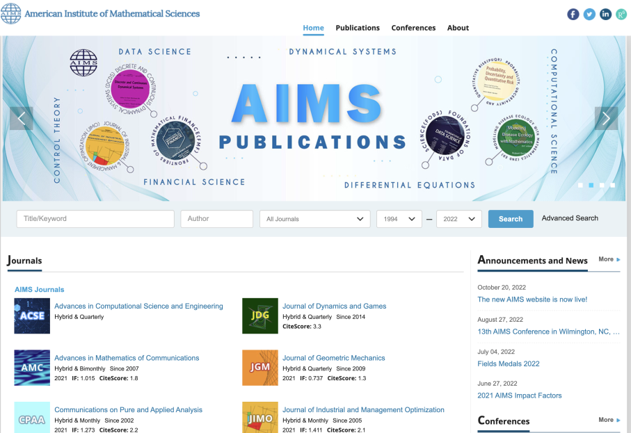 理科学科服务部 -“理”中有我,我中有你- 本期向大家重点介绍美国数学科学所期刊数据库(American Institute of Mathematical Sciences,简称AIMS)的功能、检索和应用,以方便数学专业及相关学科师生学习研究。 一、AIMS数据库介绍 AIMS出版社创立于1995年,隶属于美国数学科学研究所,主要出版自然科学类国际学术期刊。其使命是促进和加强全球范围内数学家和科学家之间的互动,通过其出版物和会议促进数学科学教育。AIMS主要致力于通过分析、建模和计算为数学家和科学家提供服务,这些数学家和科学家对微分方程、动力学系统以及它们在科学和工程领域的广泛应用具有共同兴趣。AIMS提供高水平的期刊,现由最初的几类数学专业学术期刊,发展到涵盖了数学在离散和连续动力系统、通讯、生物科学与工程、模型、控制与优化、大数据和信息分析等各个应用方面。