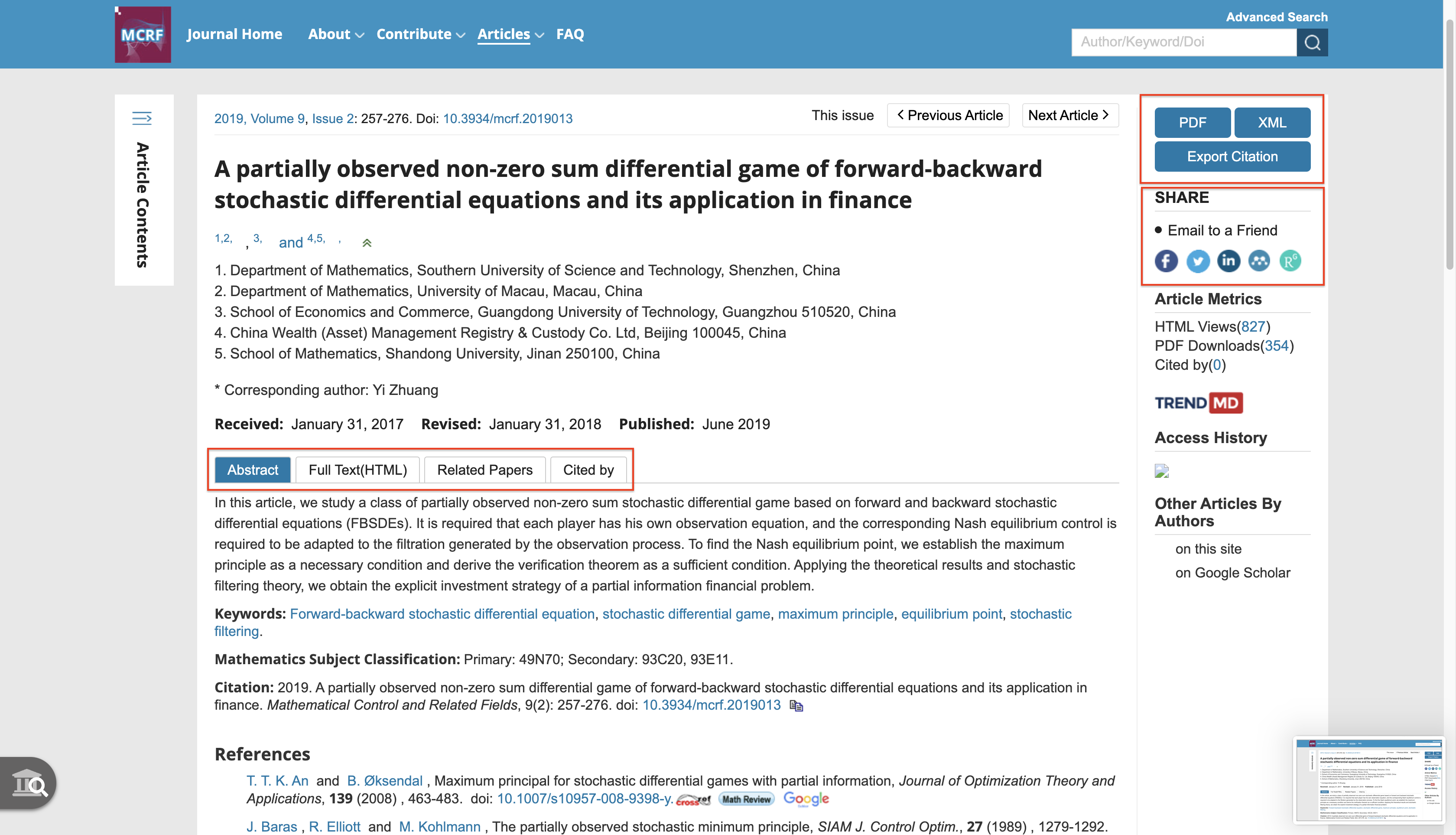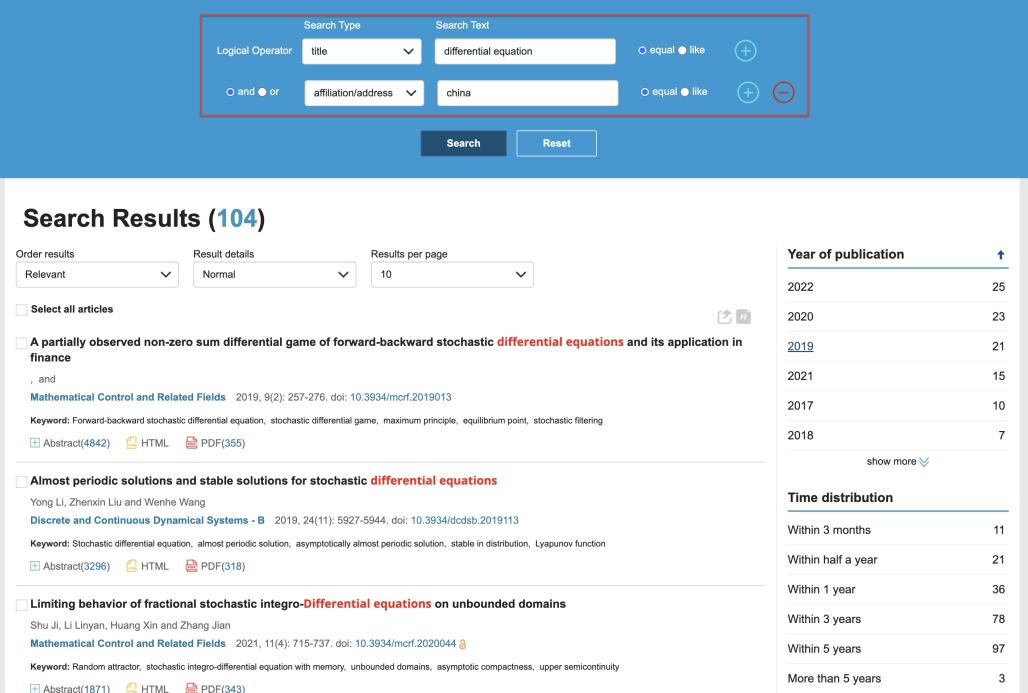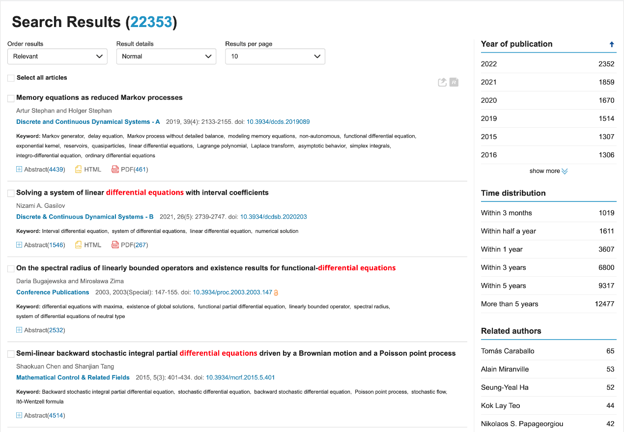 二、独有期刊介绍 三、AIMS数据库功能和检索应用 1. 浏览功能 比较直观发现需要重点关注的学术期刊目录、出版社、会议等内容。 期刊(Journals)浏览: 查看该平台出版和发行的学术期刊,关注或查看论文。 出版社(Publications)浏览:查看该平台的出版物。 会议(Conferences)浏览:查看该平台已经召开或即将召开的会议信息。 2. 检索功能 如果研究主题明确,可以利用平台的检索功能获得相关技术报告或期刊论文。 快速检索功能: 案例1:利用AIMS平台检索“微分方程(differential equation)”相关研究文献。 高级检索功能:多字段布尔逻辑组合检索,组合输入更多条件,实现精确检索。 案例2:利用AIMS平台检索中国研究人员发表的题名包含“微分方程(differential equation)”相关研究文献。 3. 文献下载 可进入文献的单独页面进行浏览、下载和分享。 特别提醒: 校外使用该数据库,请通过学校网络中心的VPN访问 师生使用中若遇到任何问题,欢迎咨询图书馆AIMS数据库负责人 联系方式:庞颂梅smpang@lib.tongji.edu.cn 图文|理科学科服务部 审核|张更平 陈欣 周玮