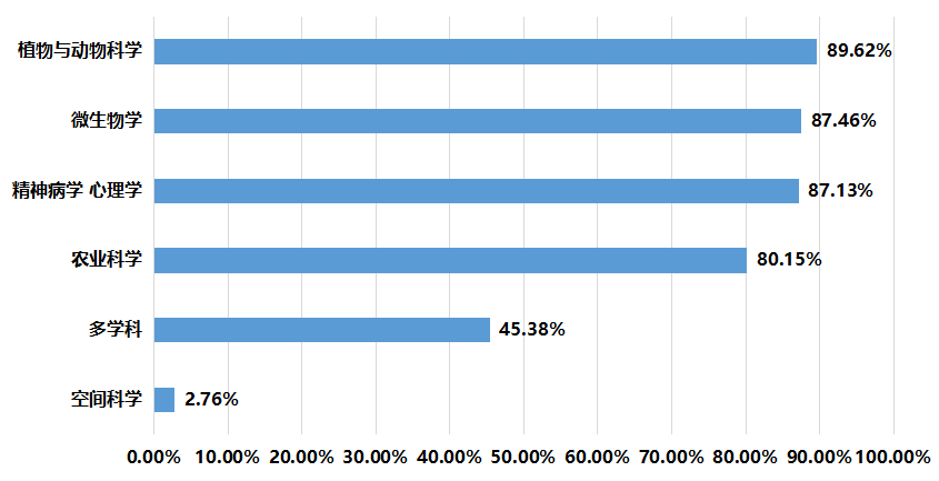 我校未进入ESI前1%的学科接近程度(我校该学科被引频次/进入ESI前1%学科被引频次阈值)如下图所示。其中,植物与动物科学、微生物学、精神病学
