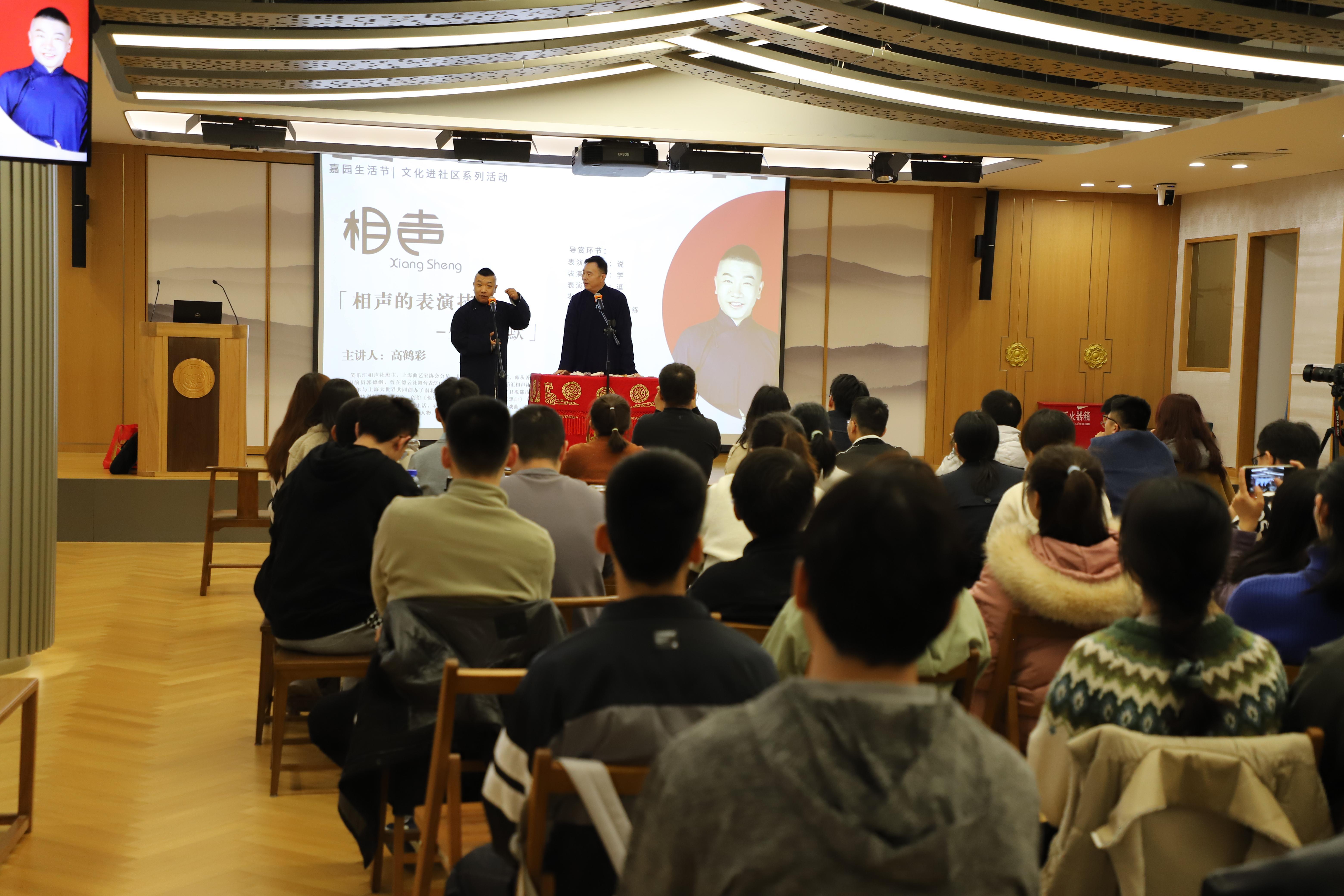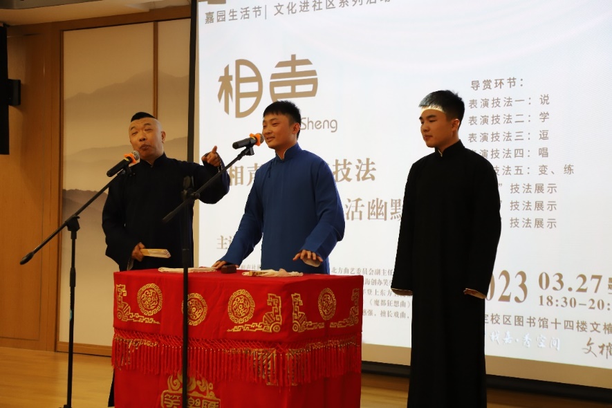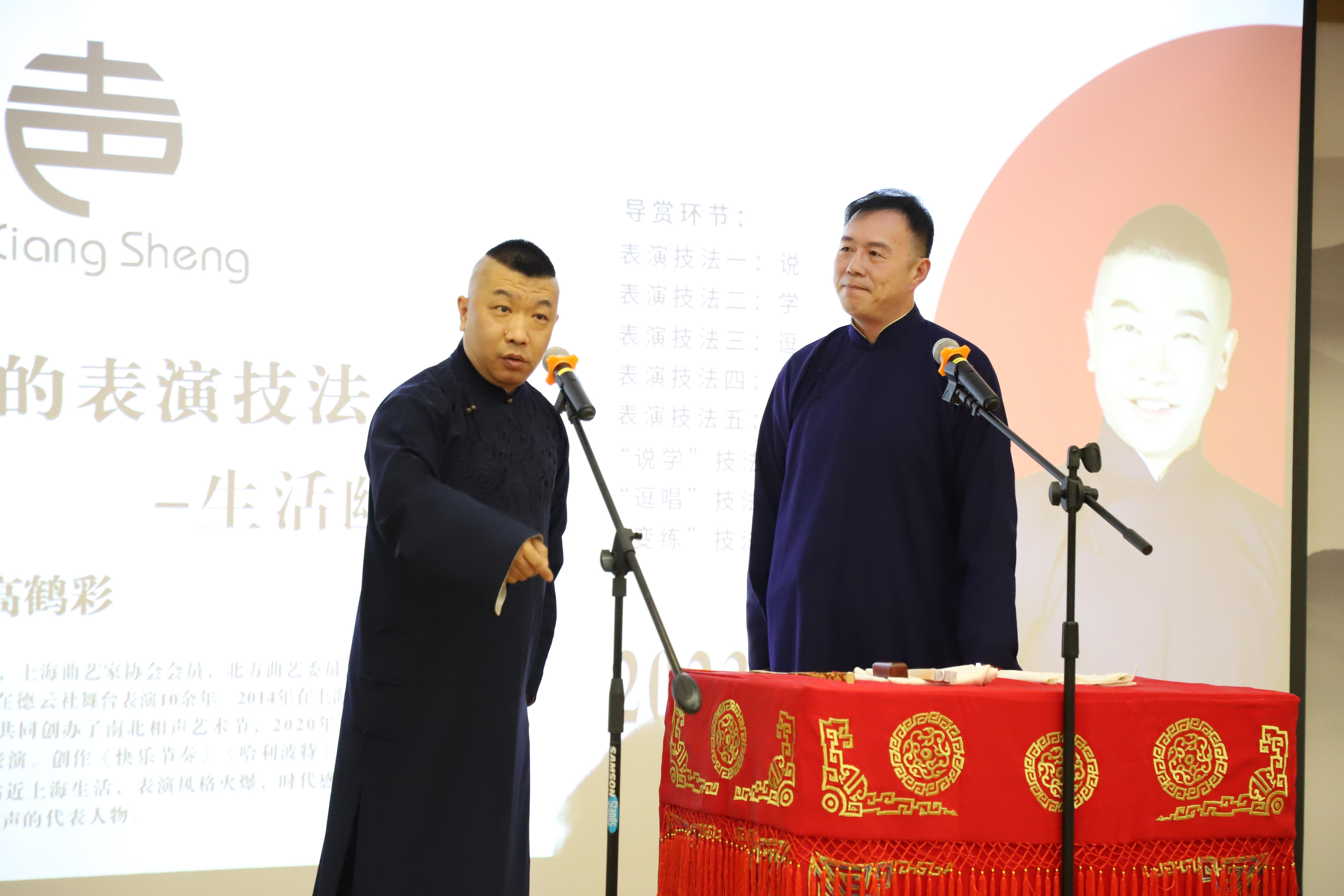 相声是大家喜闻乐见的一种民间说唱曲艺,它以说、学、逗、唱为形式,在诙谐幽默中包罗万象,在欢声笑语中感悟人生。3月27日晚,笑乐汇相声社班主、上海曲艺家协会会员、北方曲艺委员会副主任高鹤彩走进同济大学图书馆文榷堂,以生动幽默的方式向大家展现相声演员的表演技巧。 活动开始,高老师通过一段轻松愉悦的互动成功活跃了现场的气氛,随后高老师叫上团队里两位年轻的学徒上来各展示了一段贯口,配合两位学徒的表演,高老师向大家介绍相声里“说”这一技巧里最常见的贯口,贯口有名词罗列类和描述叙事类之分,讲究的是齿、唇、口和气的配合,是相声演员的必备技能。 介绍完了“说”这一技巧,笑乐汇的相声演员为大家带来了节目《学哑语》《地理图》,在逗得大家满堂喝彩的同时,更是将“说学”技巧完美解释。 活动的最后,高鹤彩老师和他的搭档张晓阳老师亲自上台为大家表演,两位老师给大家展示了“唱、变、练“的技巧,并通过京剧的表演、传统的叫卖吆喝技巧的展示以及一首《送情郎》让大家更深层地领悟到相声带来的文化传承的意义。在满堂喝彩和经久不息的掌声中,本次活动圆满结束,纵观全场活动,高老师及其团队没有选择枯燥无味的讲解,而是将相声演员技巧的展示融于一段段的表演中,同学们在开怀大笑的同时也收获颇丰。 在整场讲座的一个半小时过程中,同学们忘记了时间,充分享受着相声艺术带来的欢乐,并对于相声这门传统艺术有了更深的了解和热爱。