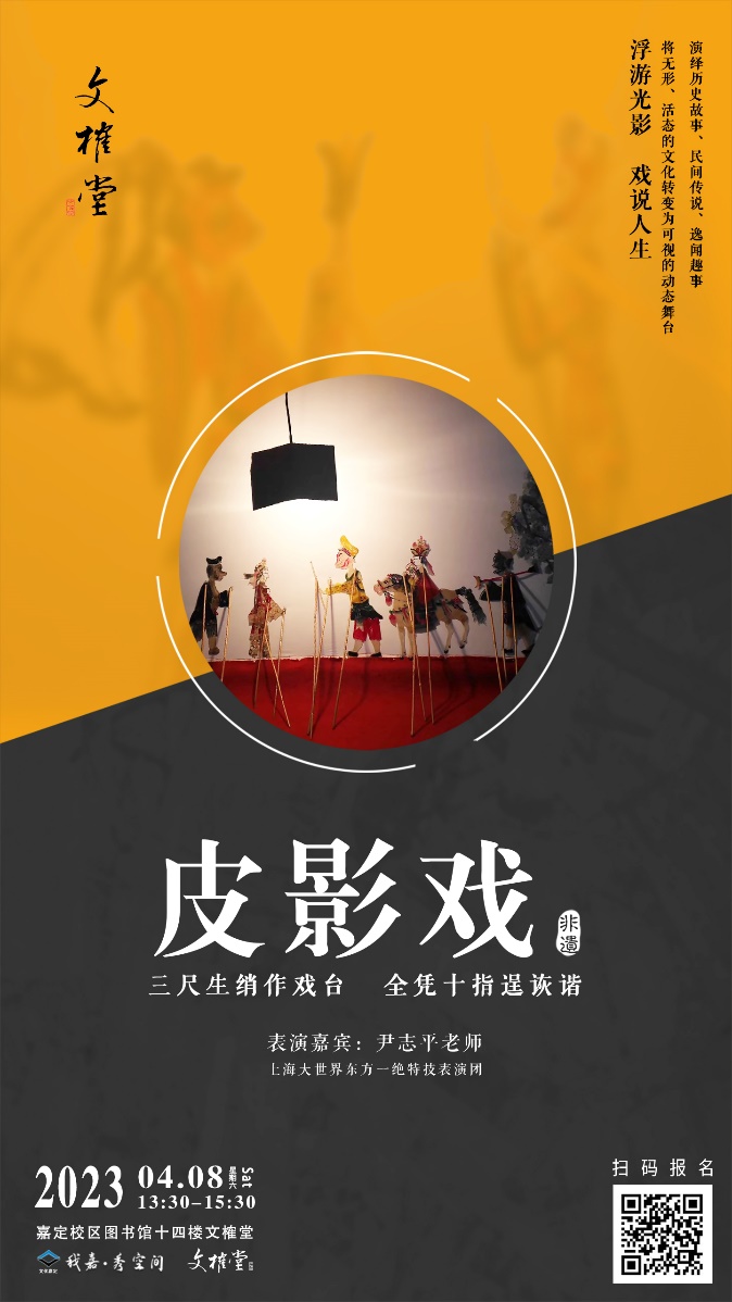 传承非物质文化遗产 延续历史文脉 4月8日 我们将邀请皮影戏大家、 上海大世界东方一绝特技表演团 尹志平老师 为同学们演绎精彩绝伦的皮影戏 诚邀各位同学相聚文榷堂 共赏光与影之间摇曳的美 【表演嘉宾】 尹志平 上海大世界东方一绝特技表演团成员。自小喜爱皮影艺术,二十多年的刻苦努力,使他对这门艺术有独到的理解并掌握了高超的制作、表演技艺。“过去为生计而演,现在因喜好而藏”,他这样评价自己对皮影的今昔变化。时代变迁使绝大多数现代人对皮影已经不再关注,但他痴心不改,对皮影戏一如既往倾注着心血。为了表演方便,他自创了一个平时可成列影偶座驾。这几年,他多次受邀到马来西亚、新加坡、德国、香港等国家和地区推广展示中国传统的皮影艺术。