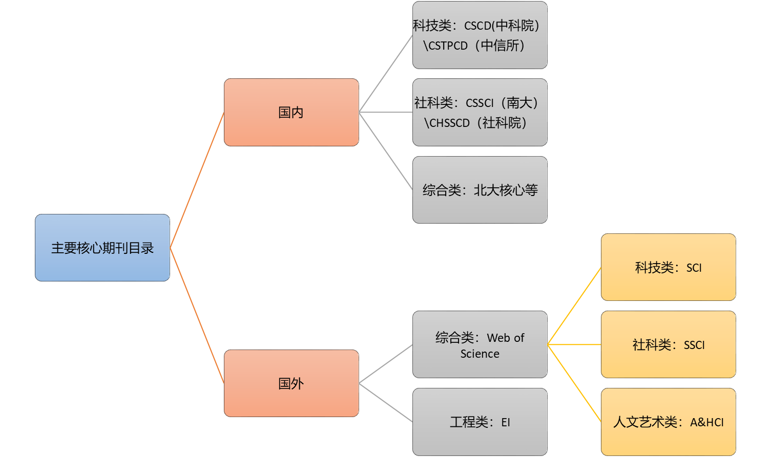 核心期刊评价体系的工作包括且不局限于遴选和评价两个方面;评价包括指标体系的建立和相应的计算,为遴选提供期刊学术影响力等数据支撑,遴选还要看期刊办刊水平等各方面能力。国内外主要核心期刊目录如图1所示,涵盖了科技类、人文社科类、工程类等各学科领域。