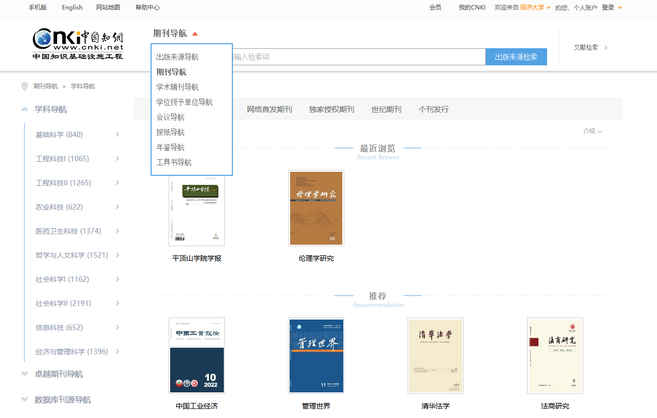 当然我们也可以通过数据库网站来查看期刊目录。如通过中国知网来查看北大核心、CSSCI等重要的中文核心期刊目录。以及可以通过EI Village平台查看工程类核心期刊目录,通过WoS平台的JCR来查看SCI、SSCI、A&HCI等核心期刊的条目及评价信息。