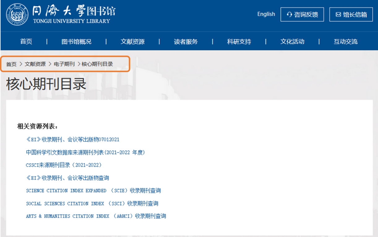 其实通过图书馆主页就可以查看核心期刊目录了,我们从主页的文献资源标签页,找到电子期刊,然后就能看到核心期刊目录的链接了。
