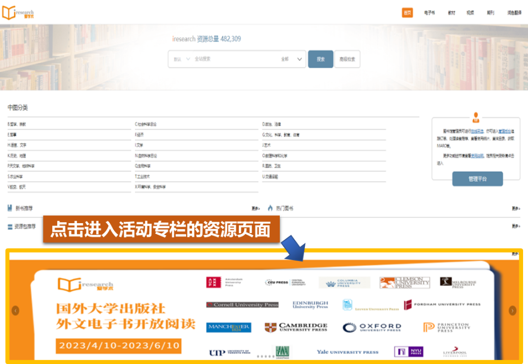 查看资源:平台首页——点击“国外大学出版社外文电子书开放阅读”轮播专栏——跳转到资源列表页(专栏内可访问图书数量:3005本),列表中的图书支持在线阅读全文(不支持下载)。