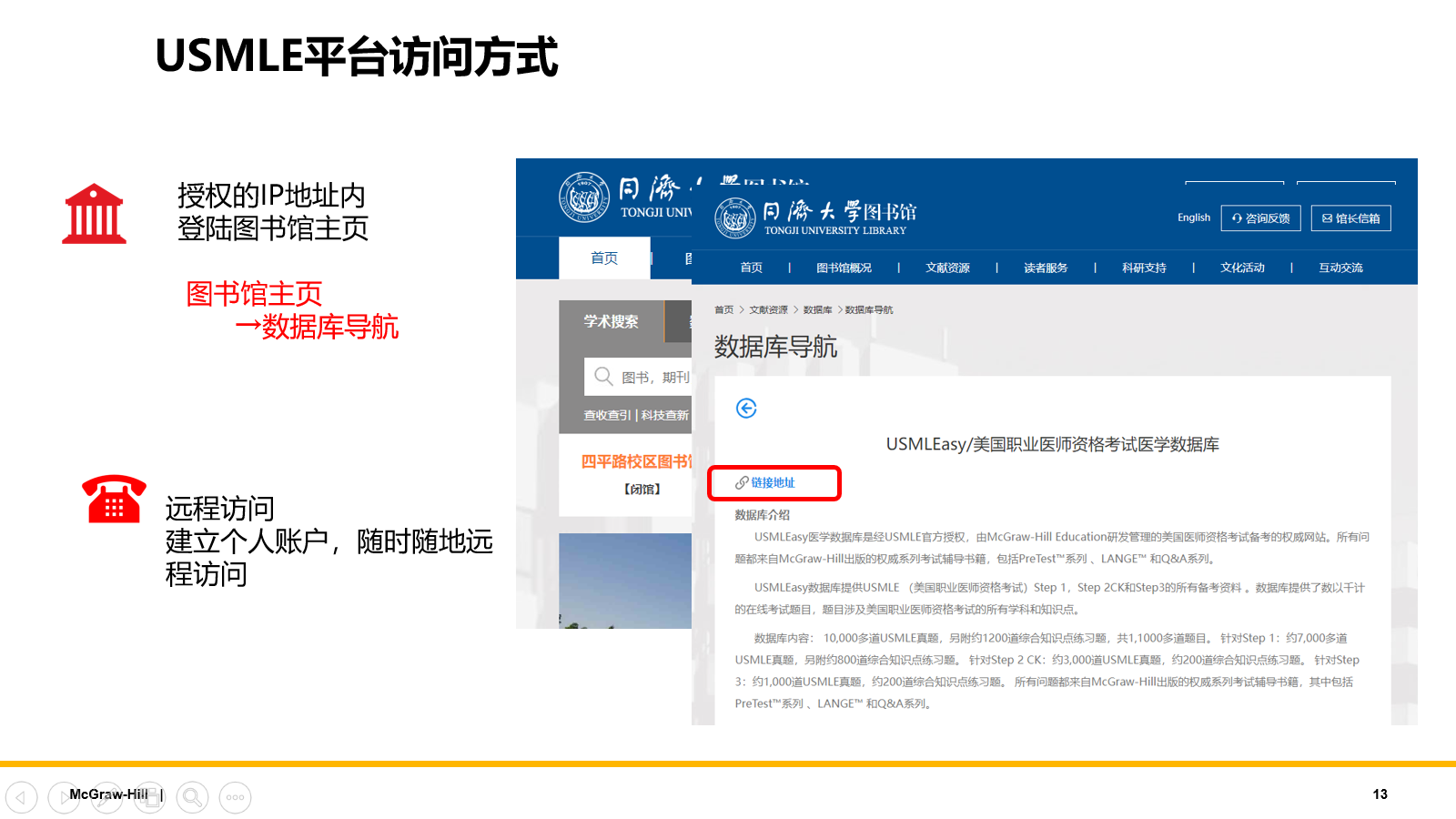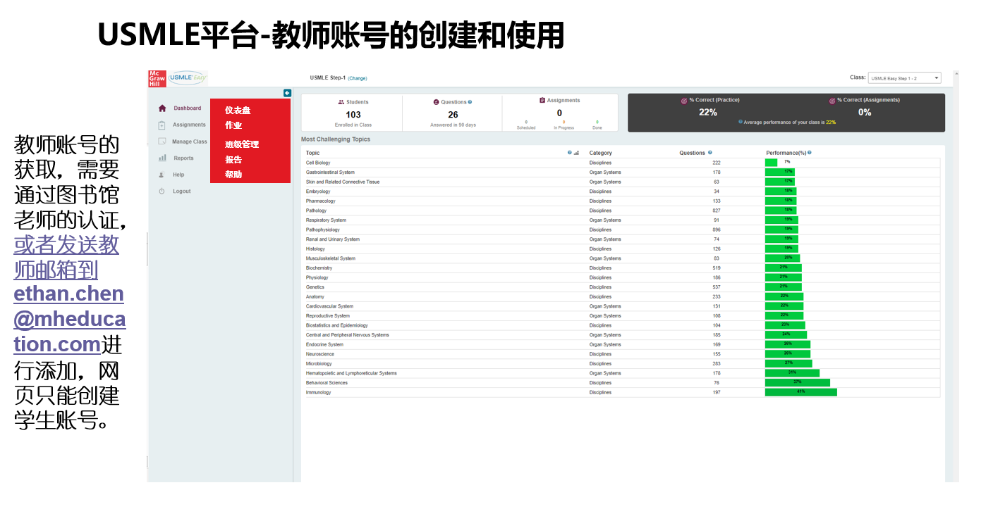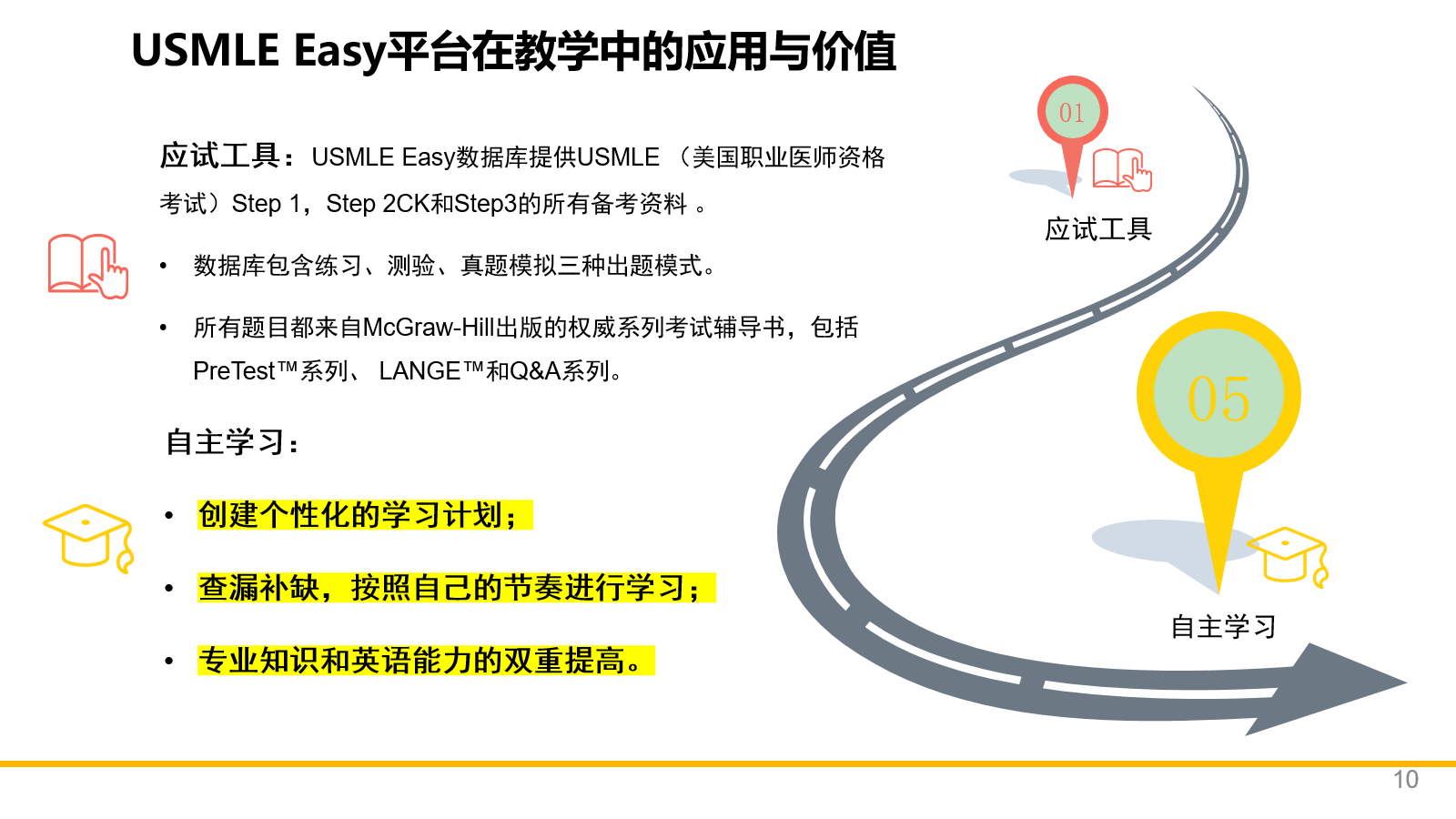 2023年4月25日下午,由医学图书馆主办的“USMLE Easy数据库助您轻松教与学”讲座在同济大学沪西校区医学图书馆多媒体教室开讲。此次讲座由医学图书馆馆员石心怡老师主持、麦格劳-希尔集团的陈健主讲。来自医学院的师生现场聆听并参与了互动研讨。 1. USMLE Easy数据库简介 USMLE 是United States Medical License Examination(美国执业医师资格考试)的简称。USMLE Easy数据库提供了数以千计的在线考试题目,题目涉及美国职业医师资格考试的所有学科和知识点。同济大学图书馆已采购该数据库。 2. USMLE Easy “教”与“学”的价值 3. USMLE平台访问方式