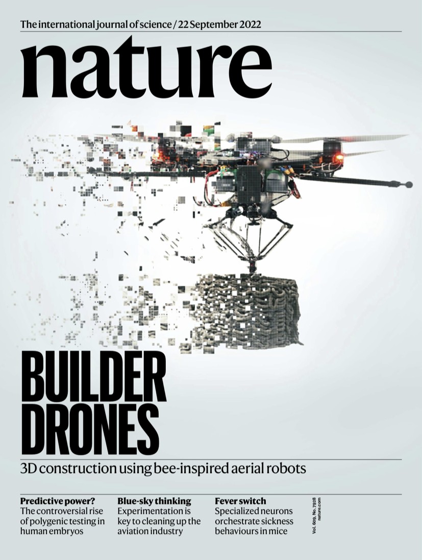 扫码了解封面故事 无人机建造师 封面故事3 地面机器人有望用于建筑行业,但它们受到高度上的限制。在本期《自然》中,Mirko Kovac、Robert Stuart-Smith和同事描述了高度机动、能执行增材3D建造任务的空中机器人。研究团队以自然建筑师胡蜂和蜜蜂等为灵感,开发了BuilDrone(如封面所示)。该无人机能进行自主团队协作,用基于泡沫或水泥的材料执行3D打印任务。团队还开发了ScanDrone无人机,用于评估建造好的结构的质量。研究团队希望这种“空中增材制造”方法能够在难以抵达的区域用于工程建设。