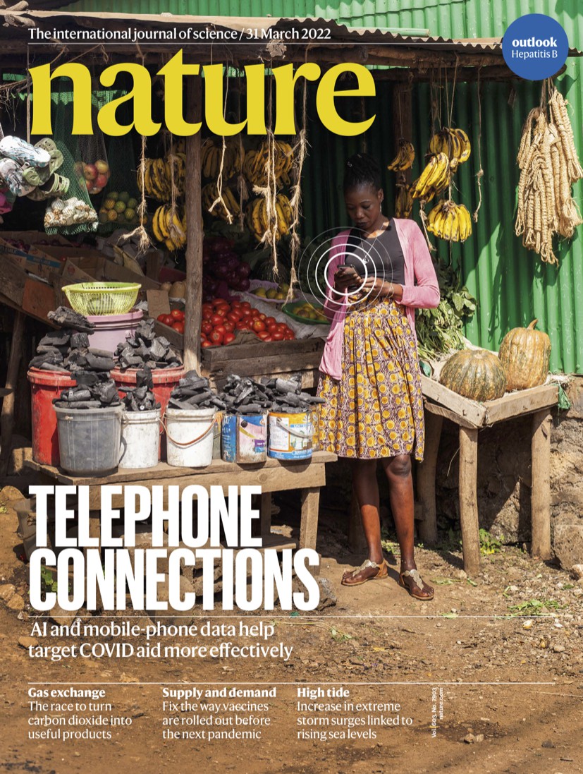 扫码了解封面故事 通讯连接 封面故事2 封面所示为肯尼亚Matasia村庄的Yournina Akinyi在她的货摊旁使用手机。在本期《自然》中,Joshua Blumenstock和他的同事用研究表明了手机大数据如何能提升人道主义救助的定向分配。如何在一场危机中快速找到最需要帮助的个体是一项巨大挑战。Blumenstock和他的团队先利用传统的调研数据训练机器学习算法,用来识别手机数据中的贫困规律,随后再将他们的方法用于多哥当地数百万美元新冠纾困金的分发。研究团队发现,和更传统的定向分配方法相比,他们的机器学习方法能将有需要个体错过救助的比例减少4%-21%,这说明手机这类数据来源或能增强危机期间的援助分配。