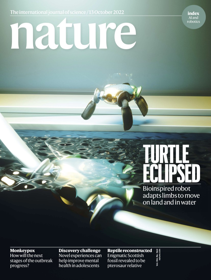 扫码了解封面故事 两栖龟机器人 封面故事5 不同地形对机器人的移动性构成了极大挑战,尤其是当机器人需要在不同环境之间移动时。在本期《自然》中,Rebecca Kramer-Bottiglio和她的同事报道了一种能在陆地和水体之间移动的多环境机器人。研究团队以现实生命世界为灵感设计了这款机器人,使其能在陆地地形上采用陆龟构型,在水体环境中采用海龟构型。这种“自适应形态发生”(adaptive morphogenesis)设计策略让这个“两栖龟机器人”(Amphibious Robotic Turtle)能够根据不同环境改变其四肢形态和步态。 数字资源介绍 Nature Portfolio期刊包括国际领先的《自然》周刊及其旗下一系列研究和综述类期刊,也包括涵盖广泛学科领域的开放获取期刊《自然-通讯》与《科学报告》。 40种《自然》系列研究期刊涵盖生命科学、物理科学、临床科学和社会科学领域,不仅发表基础研究,也发表综述、批判性评论和分析。 24种《自然综述》系列期刊提供权威的、易于理解的、意义重大的综述内容。无论在哪一领域,高质量的图像和精炼的内容都提供背景知识和相关联接。 图片| Springer Nature公司