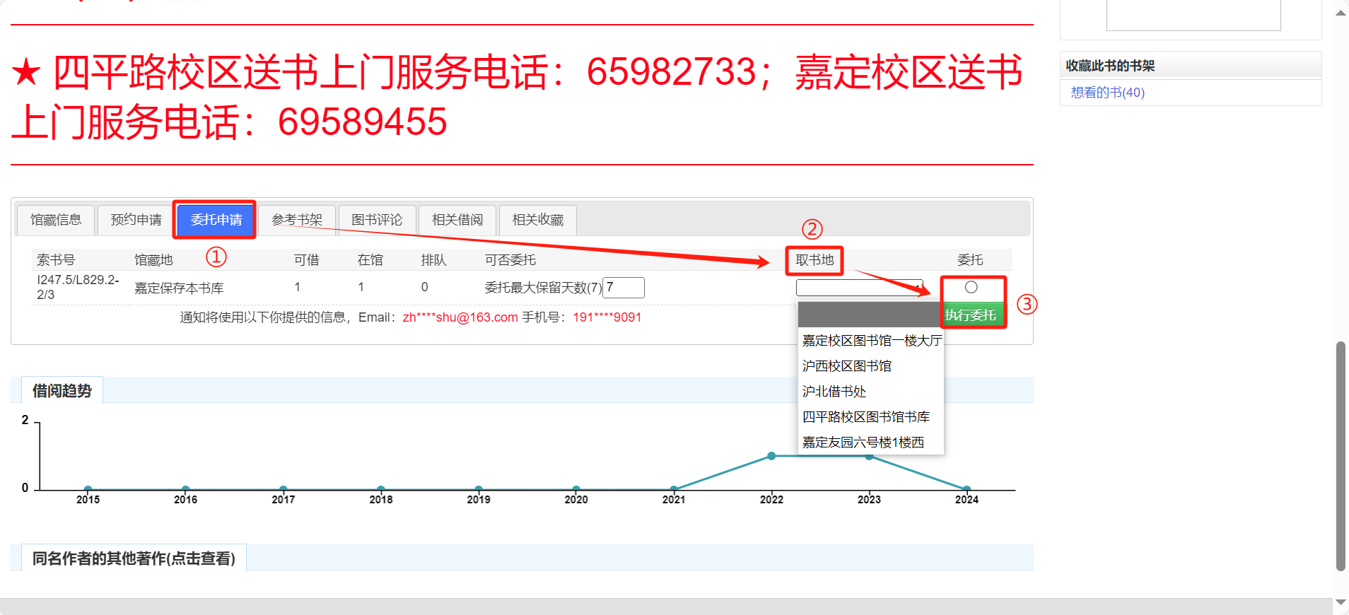 3.选择“委托申请”,选择取书地,执行委托。