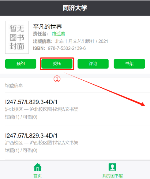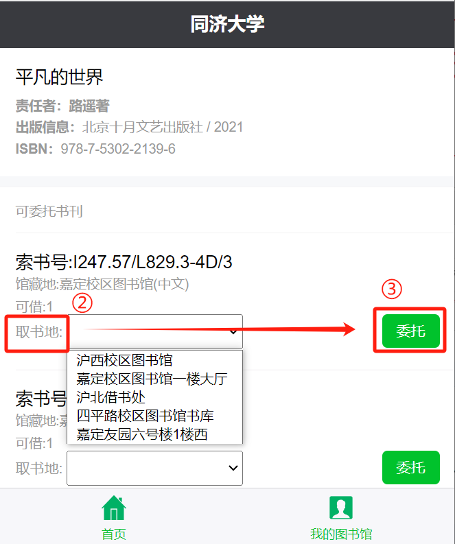3.选择“委托申请”或“委托”,选择取书地,执行委托。
