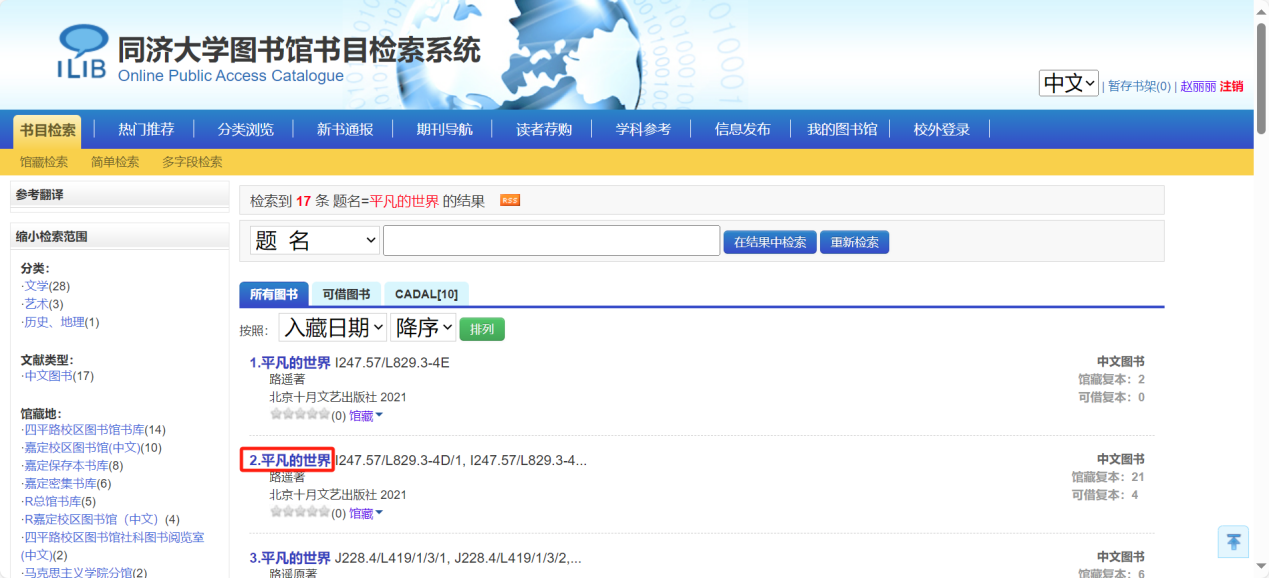 同济大学图书馆 同济大学图书馆服务 2.选择“馆藏书刊查询”或“图书查询”查到图书信息后,点击书名进入详细信息页面;