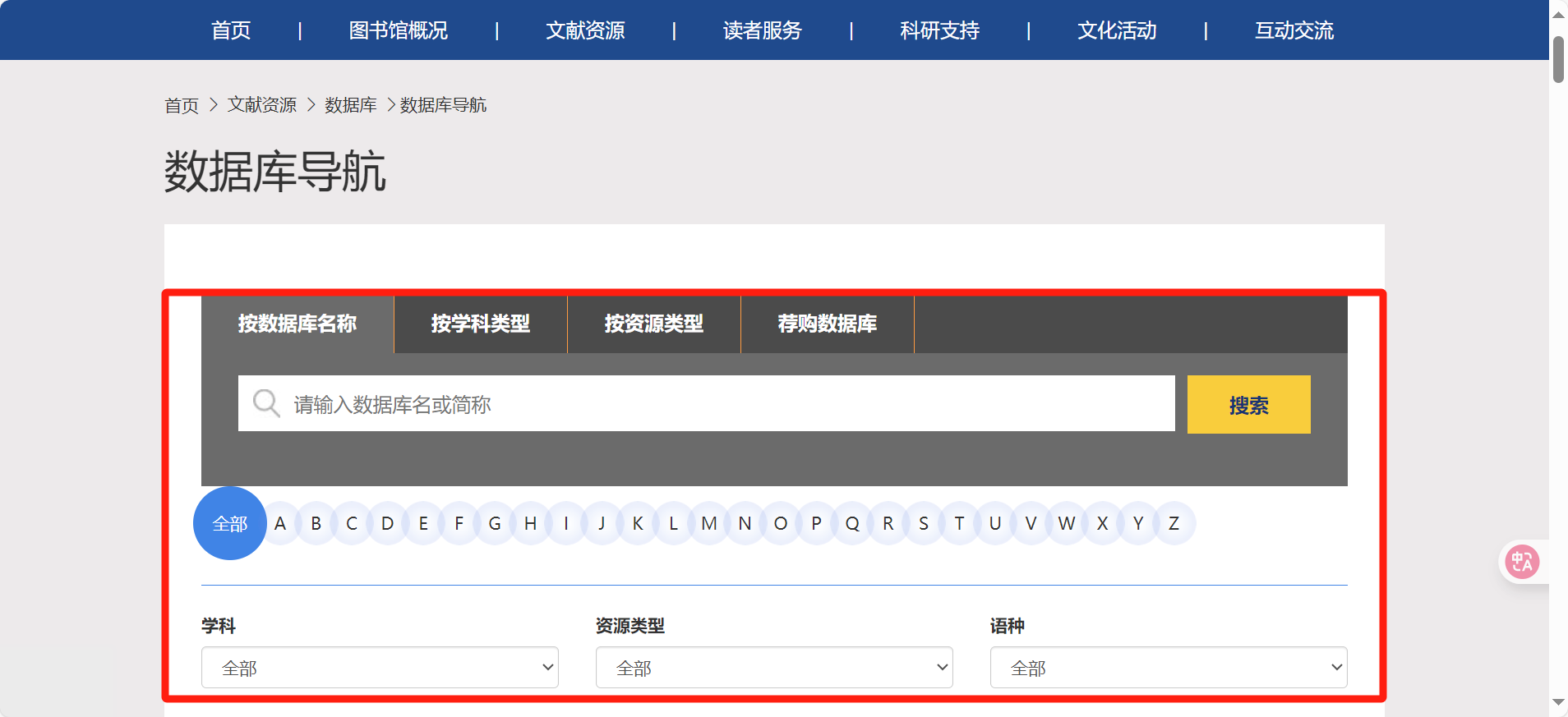 1 “学术搜索”一站式检索 “学术搜索”能够一站式检索图书馆购买的绝大多数中外文文献资源,文献总量庞大且每日进行更新。 注意:部分资源尚未接入学术搜索,建议直接访问相应数据库进行检索,或通过荐购与文献传递获取。 2数据库检索 你也可以直接访问数据库查找电子资源,支持按学科、资源类型、语种等方式筛选目标数据库。