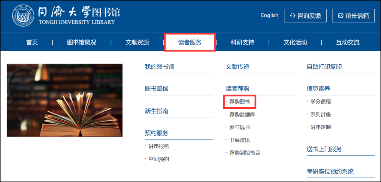 (1)中文图书荐购——同心汇采荐购系统 同心汇采荐购系统 “你选书,我买单,送到手,看完还”。该服务由图书馆与京东平台联合推出,你可以在系统中直接挑选所需的中文图书。只要图书符合馆藏要求且复本数量未达上限,即可下单购买。图书将直接邮寄到你手中,阅读完毕后归还图书馆,全程无需支付任何费用。 (2)外文图书、丛书、套书荐购——图书馆荐购系统 图书到馆后会发送提醒至你认证的邮箱,该书将留置在你预约的校区图书馆咨询台一周。