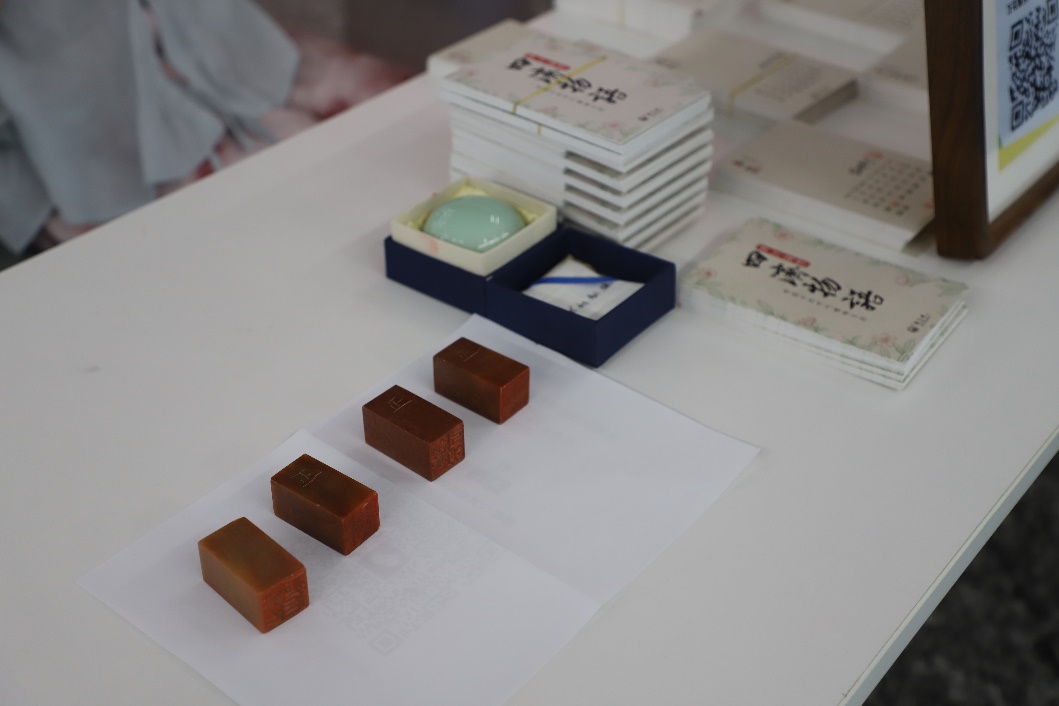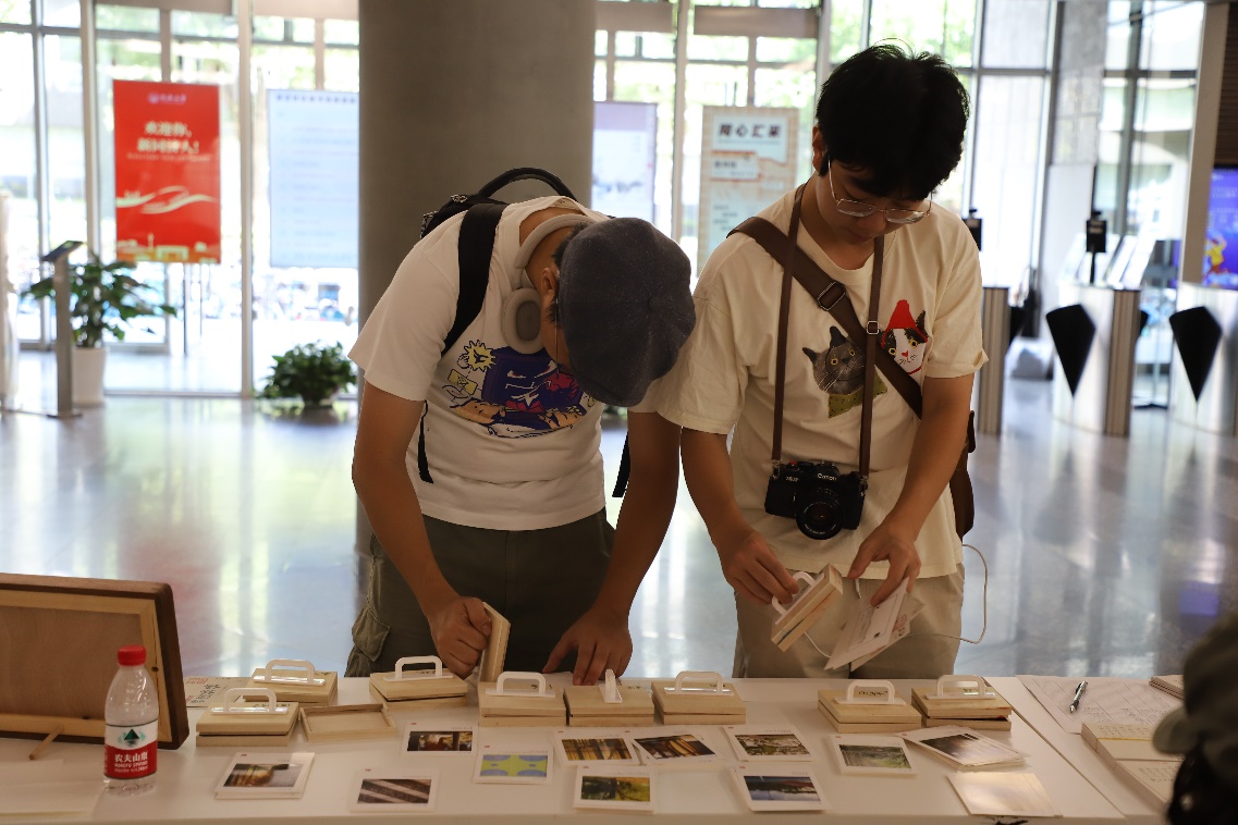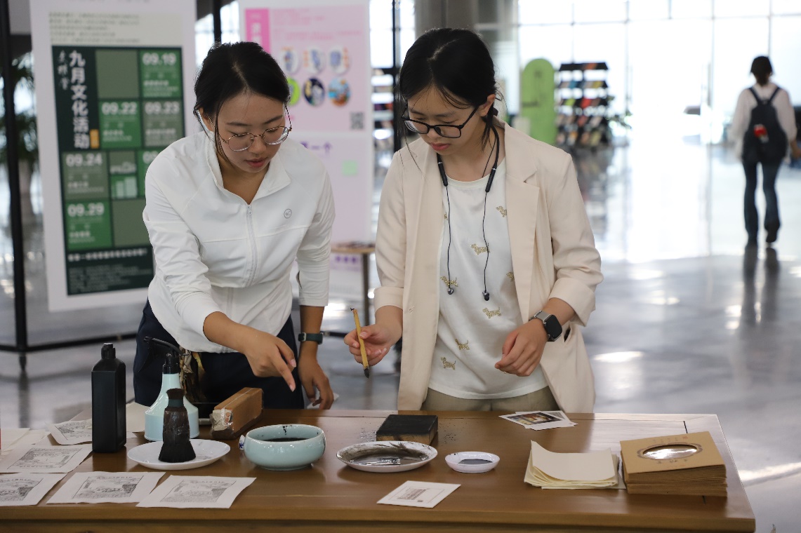“文化长廊”区域,文化展览、工坊课程、文榷讲堂与文榷月历等集中呈现,展示了图书馆的文化育人理念与丰富资源。“文化长廊”目前仍在嘉定校区图书馆一楼展出。“文榷工坊”成为体验实践的热门打卡点。师生可亲身体验木版水印、金石钤印等传统技艺,刷印一幅同济校园主题木版画,盖一枚图书馆建筑专属印章,让文化在指尖“活”起来。现场还陈列了历年师生在文榷工坊创作的精品,展现了浓厚的文化传承氛围。体验打卡的同学可兑换限定款“四济物语·校园廿四节气植物图谱月历”,将校园时序与传统文化智慧融入日常学习生活。