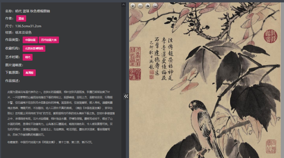 每一幅作品的详情页面都能看到其具体信息,如:名称、作者、尺寸、材质、收藏机构、艺术时期以及描述等。用鼠标进行拖放和滚动操作可以对图片进行放大和缩小,仔细查看画作的细节。而最重要的是可以下载高清图片,注意只可用于教学科研目的哦~