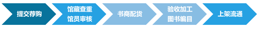 读者填写荐书信息并提交。 2.馆员审核处理 审核荐书是否符合采购要求并查重: ①已有馆藏(纸质书/电子书)→反馈读者图书在馆架位或阅读链接; ②未有馆藏→发送订单向书商征订。 3.书商配货 书商从各地调配图书。外文原版图书受海关、物流等影响到书周期通常在3-6个月左右,有时还会出现等候出版社按需印刷、无货等复杂情况。 4.验收、编目和加工 新书验收入账后要详细编目以便读者检索,还要贴标、典藏等。 5.上架 荐书将留置咨询台一周时间方便读者借阅,之后会根据索书号回到书架上,盼望着迎来下一次召唤。