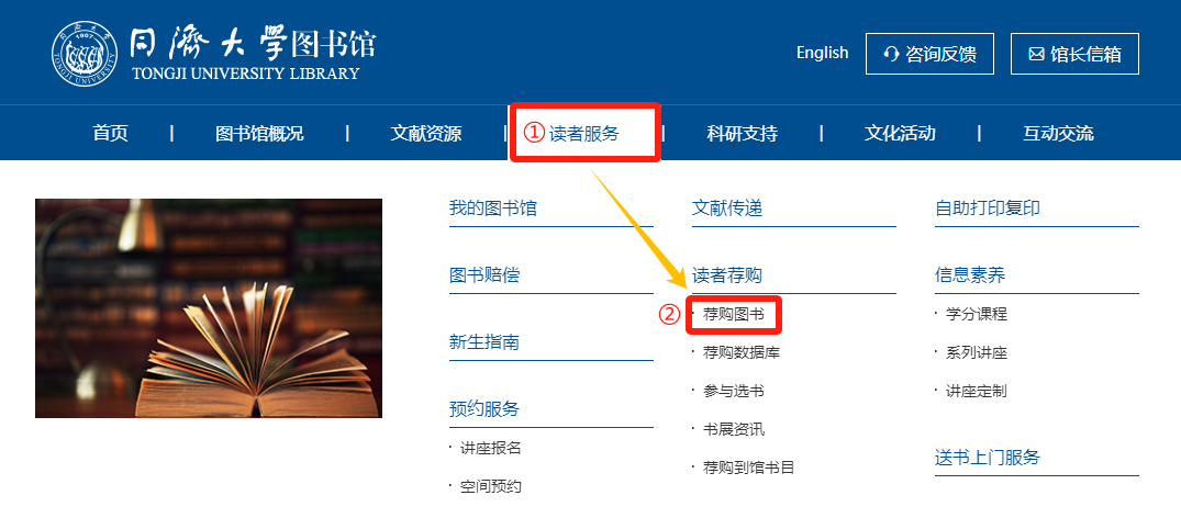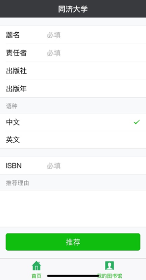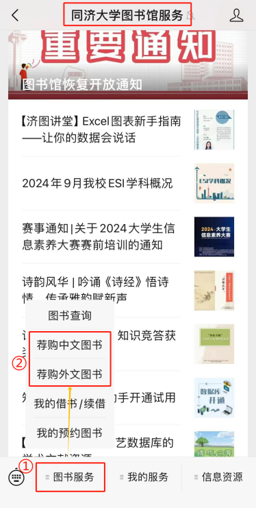 02移动端荐购 找到“同济大学图书馆服务”微信公众号,菜单栏选中【图书服务】-【荐购中/外文图书】,填写表单提交就完成荐购啦!