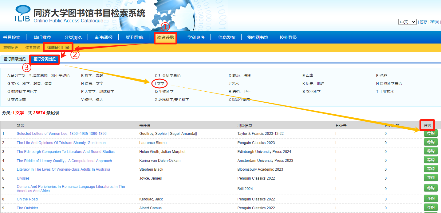 小贴士:如何跟进荐书进度? 如果在【我的图书馆】-【修改信息】模块中登记了邮箱和手机信息,你就会第一时间收到荐书的处理进度和到馆通知哦! B.征订目录荐购选择左上角的“详细征订目录”选项。 选中不同的分类,下方的书单就会随之变化。 选择想要推荐的图书,点击右侧的“荐购”按钮,就能直接推荐给图书馆啦,是不是很方便呢?