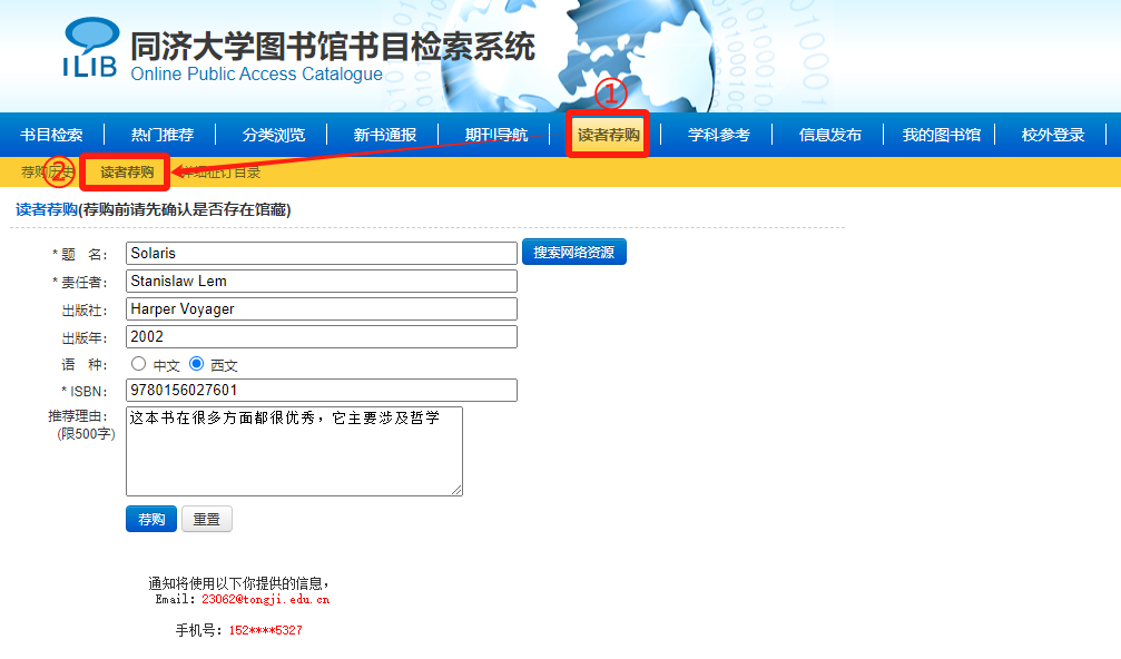 2.外文图书、丛书、套书荐购——图书馆荐购系统 (网页端:https://webpac.tongji.edu.cn/asord/asord_redr.php) 想要的书在同心汇采平台里查不到? 图书馆荐购系统来帮忙! 专为读者个性化的阅读需求保驾护航 中、外文专著图书,丛书、套书任你推荐 更能全程掌握荐书反馈、图书到馆最新动态 往下翻,解锁详细使用指南!