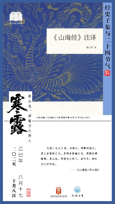 ![]() 《山海经·西山经》原文又西二百九十里,曰泑山,神蓐收居之。其上多婴短之玉,其阳多瑾瑜之玉,其阴多青雄黄。是山也,西望日之所入,其气员,神红光之所司也。 《山海经》是中国古老的博物志与神话地理志。书中描绘了人神杂糅、万物有灵的瑰丽世界,其中众多山川神祇、奇禽异兽的样貌与神力,皆与特定的时节和物候息息相关。寒露节气,我国北方地区大多露水凝寒,秋意肃杀,正是秋神蓐收显现其威仪之时。翻开《山海经》,我们可循着先民的脚步,探寻季节变换背后恢弘的神话叙事,想象寒露的清冷。 典籍撷珍《山海经》现存十八卷,包括《山经》五卷和《海经》十三卷。书中记录了约五百余座山、三百余条水道、上百个国度部族以及数百种异兽,这不仅奠定了中国神话的根基,也保存了大量的地理、物产、巫术、医药等珍贵资料。 《山海经》中虽未直接出现“寒露”之名,但其记录的秋神蓐收,正是秋季物候现象的神话源头,为理解寒露节气提供了深厚的神话语境。寒露三候:“一候鸿雁来宾,二候雀入大水为蛤,三候菊有黄华”,皆可在《山海经》的奇幻世界中找到呼应。 居于泑山的蓐收,其降临带来的正是寒露时节的肃杀与收敛之力。寒露节气的首要特征是“寒露惊秋晚”,气温骤降,露水从清凉变为寒凉。这并非无缘无故的气候变化,在神话逻辑里,这正是蓐收“乘两龙” 巡行北方的结果。他驾驭的龙所带来的不再是夏日的暖湿气流,而是来自西方泑山、日落之地的清寒之气。他所经之处,风便有了凉意,夜间凝结的露水便带上了寒意。因此,“寒露”之“寒”,可视为秋神蓐收降临后,由其神威所施加于大地的温度标记。 阅读《山海经》的意义,在于触碰中华民族奇幻奔放的想象力源头,理解先民如何将自然现象化为生动叙事。寒露读《山海经》,希望师生能在逆势升温的上海,想象那份将天象物候与神祇异兽相联结的磅礴诗性,体会季节更迭在古人心中激起的敬畏与共鸣。 济图书荐1、《山海经》与中国上古天象学,尹荣方著,上海社会科学院出版社,2025 索书号:K928.626/Y522 馆藏地:四平路校区图书馆书库一楼(新书)
