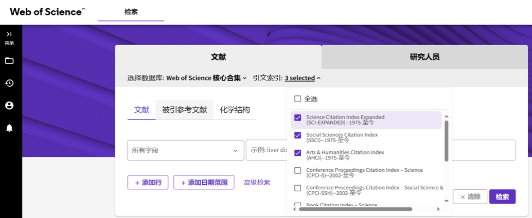 Science核心合集中含有SCIE(自然科学引文索引)、SSCI(社会科学引文索引)、A&HCI(艺术与人文引文索引)三大核心引文索引数据库。