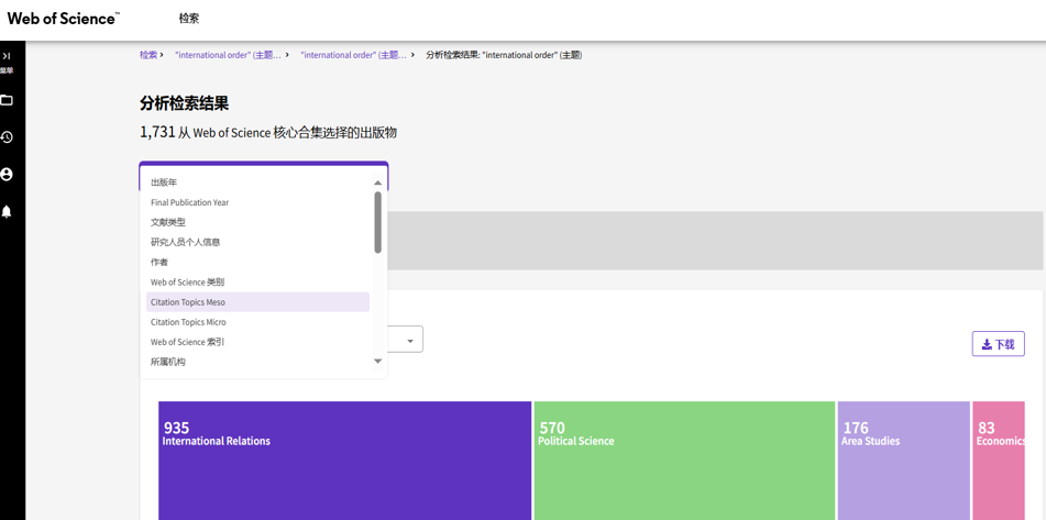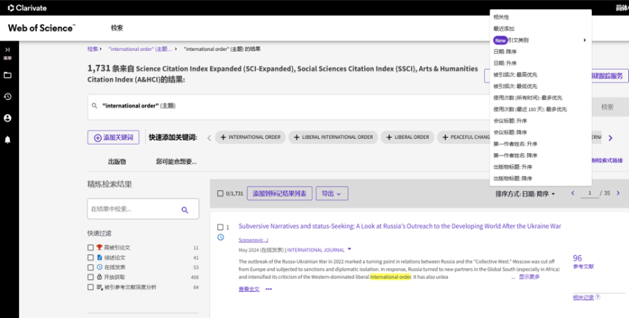 order(国际秩序:尽可能输入英文)”进行检索后,可得到1731条检索结果。