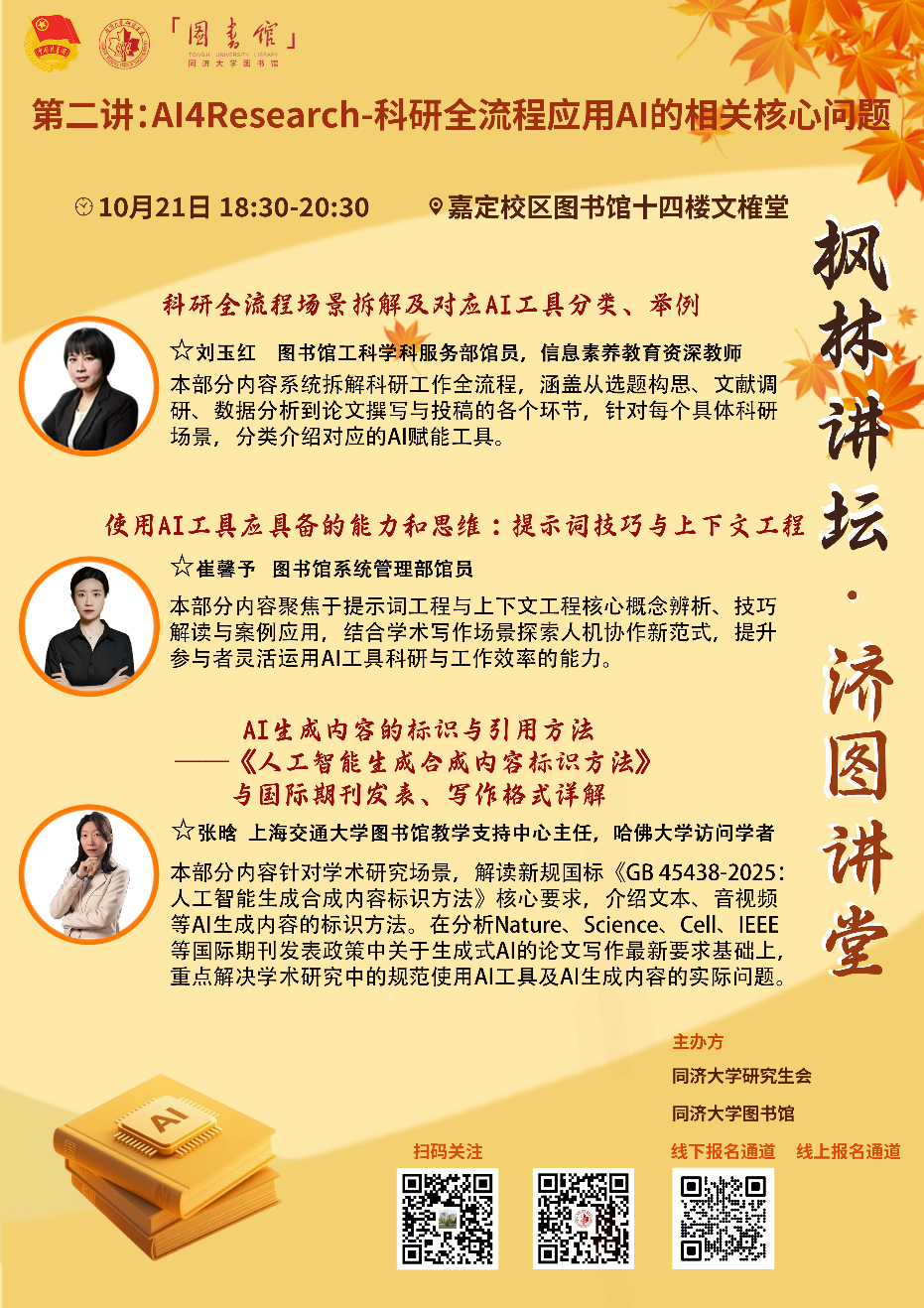 以下是讲座具体安排和主题等信息: 模块一:科研全流程场景拆解及对应AI工具分类、举例 主讲人:刘玉红(图书馆工科学科服务部馆员,信息素养教育资深教师) 嘉宾简介:同济大学图书馆工科学科服务馆员,信息素养教育资深教师。长期从事信息咨询、信息素养教育、学科服务工作,面向本科生、研究生、留学生开设文献检索相关中英文课程多门。 主讲内容:本部分内容系统拆解科研工作全流程,涵盖从选题构思、文献调研、数据分析到论文撰写与投稿的各个环节,针对每个具体科研场景,分类介绍对应的AI赋能工具。 模块二:使用AI工具应具备的能力和思维:提示词技巧与上下文工程 主讲人:崔馨予(图书馆系统管理部馆员) 嘉宾简介:工学硕士,图书馆系统管理部馆员,主要研究方向数据分析与挖掘,已举办多场人工智能与提示词专题讲座。 主讲内容:本部分内容聚焦于提示词工程与上下文工程核心概念辨析、技巧解读与案例应用,结合学术写作场景探索人机协作新范式,提升参与者灵活运用AI工具提升科研与工作效率的能力。 模块三:AI生成内容的标识与引用方法—《人工智能生成合成内容标识方法》与国际期刊发表、写作格式详解 主讲人:张晗(上海交通大学图书馆教学支持中心主任) 嘉宾简介:上海交通大学图书馆教学支持中心主任,哈佛大学访问学者。具有丰富的信息素养教学、讲座培训经验。发表多篇CSSCI核心期刊论文,曾获上海市科学技术情报成果奖、上海交通大学晨星优秀青年教师奖、上海交通大学管理服务奖等。 主讲内容:本部分内容针对学术研究场景,解读新规国标《GB 45438-2025:人工智能生成合成内容标识方法》核心要求,介绍文本、音视频等AI生成内容的标识方法。在分析Nature、Science、Cell、IEEE等国际期刊发表政策中关于生成式AI的论文写作最新要求基础上,重点解决学术研究中的规范使用AI工具及AI生成内容的实际问题。 模块四:讲座总结+分享讨论