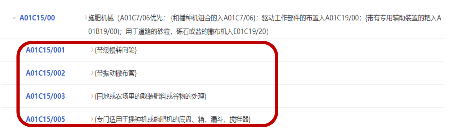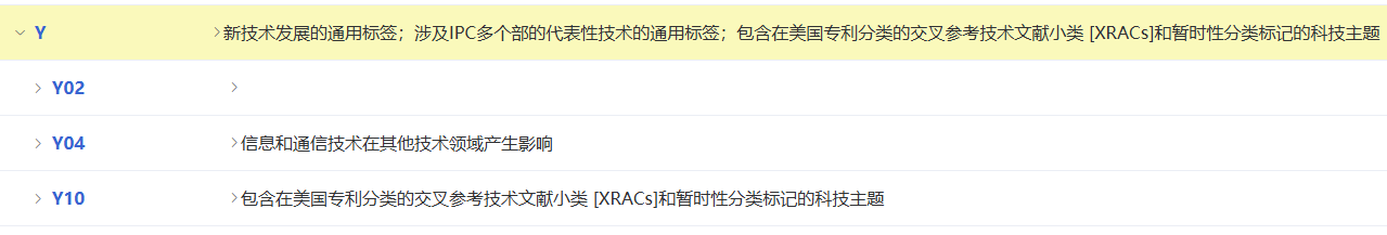 CPC 共分为9个分部,在A-H部的基础上增加了Y部,用于容纳新技术和跨领域技术等,并加入了美国专利分类交叉索引(XRSCs)和摘要内容。 节选自国家知识产权局CPC分类导航(Y部) 主体部分采用了与IPC相同的分层结构,包括5个主要层级,从高到低分别是部、大类、小类、大组或小组(具体不再赘述,可以参考上文IPC分类了解)。 在CPC分类表中,有些类名用大括号"{...}"表示,表示CPC组别的内容在IPC分类中不存在,或表示在IPC基础上增加了新的内容。(见图2) 节选自国家知识产权局CPC分类导航(A部)