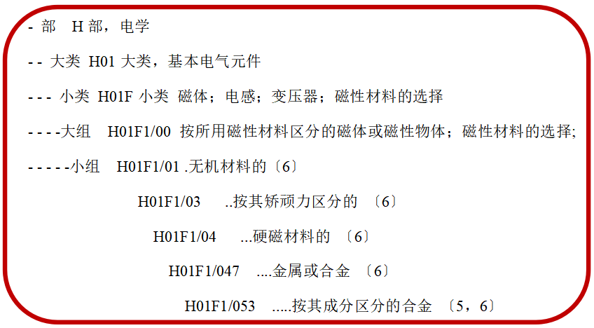 每一部被细分为若干大类,每个大类被冠以该部代码+两位数字。如:H01 每一大类都包括一个或若干个小类,小类被冠以该大类代码+一个大写字母。如:H01F 每个小类又被划分为组。大组的代码由小类代码+一个数字和/00组成。如:H01F1/00 小组是大组以下的分类。小组代码与大组代码不同,"/"之后采用了0以上的数字。如H01F1/01 最后,小组又形成自己的分级结构。其等级结构是由圆点数来确定的,圆点越多等级越低,小组的技术主题范围是由它与它前面级别比它高的组共同确定。 这样,我们就有了如下的结构: 注:分类号后的方括号内的数字(〔2〕-〔8〕)表示所采用的IPC的修订版次。上述中的〔6〕表示IPC第六版。 作为全球广泛应用的经典分类体系,IPC为专利信息的规范管理奠定了重要基础。在其框架之上,为进一步适应全球专利检索的发展需求,由欧洲专利局(EPO)和美国专利商标局(USPTO)联合开发的联合专利分类(CPC)分类体系应运而生。它在兼容IPC核心结构的同时,实现了更细致的技术划分。 二、联合专利分类(CPC)