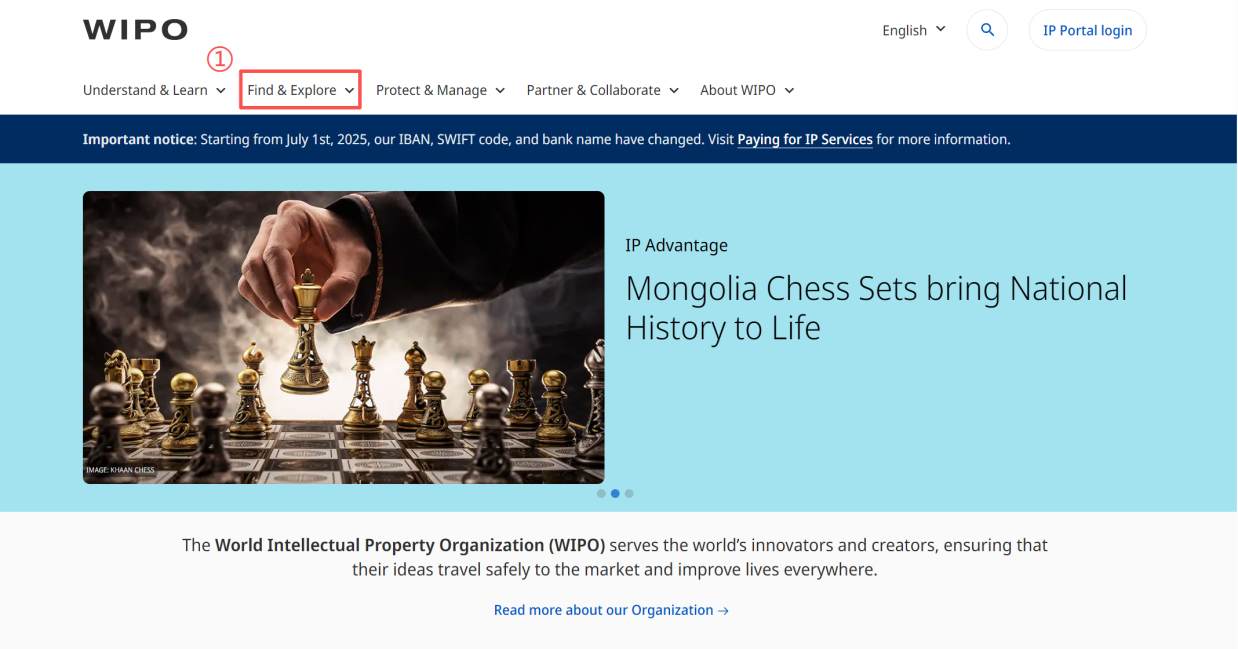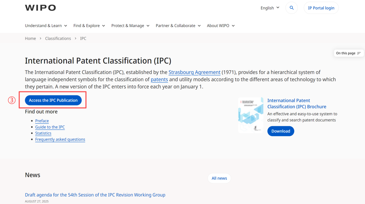 亲爱的老师、同学们,在查找国际前沿专利技术时,您是否常陷入 “海量信息难筛选、目标成果找不准” 的困境?明明想锁定创新方向,却在全球千万件专利的 “信息海洋” 里找不到头绪?别着急!今天就为大家介绍专利检索的两大 “核心利器”—— 国际专利分类(IPC)与合作专利分类(CPC)。它们就像专利世界的 “智能导航仪”,能带您精准穿梭于各类技术主题的 “专利森林”,轻松定位到您需要的创新成果,帮您顺利打开通往专利智慧宝库的大门。 一、 国际专利分类(IPC) 1.什么是IPC? IPC是英文International Patent Classification的简称,根据1971年签订的《国际专利分类的斯特拉斯堡协定》编制。1996年我国正式向WIPO申请加入《国际专利分类斯特拉斯堡协定》,1997年6月19日,中国正式成为《国际专利分类特拉斯堡协定》的成员国。 IPC分类表由世界知识产权组织(WIPO)发布,官方语言为英文和法文,最新版本可在其官方网站https://www.wipo.int/portal/en/index.html获取(见下图)。