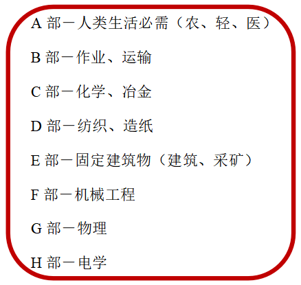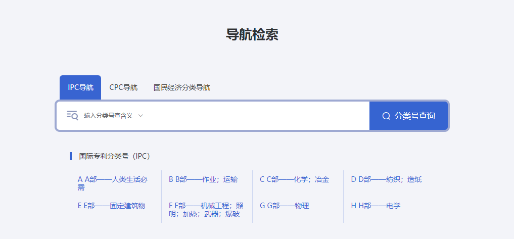WIPO国际专利分类(IPC)查询界面 也可登录国家知识产权局(https://pss-system.cponline.cnipa.gov.cn/navigationSearch)直接获取中文版。 国家知识产权局分类导航界面 根据1971年签署的《斯特拉斯堡协定》,“国际专利分类”可简写成Int.cl,并且加在根据该专利分类法分类的专利文献的分类号前面。目前各主要国家的专利说明书的扉页(51)项都印有IPC分类号。(见下图,图中的(2006.01、2020.01、2023.01)代表国际专利分类表不同的版本) 中国发明专利申请扉页(示例) 2.IPC分类表的等级结构 IPC采用了功能和应用相结合,以功能性为主、应用性为辅的分类原则。IPC分类表按照等级可分为:部(Section)、大类(Class)、小类(Subclass)、大组(Main group)、小组(Subgroup)。 IPC分类表一共分为八个大部,用A~H表示,分别为:
