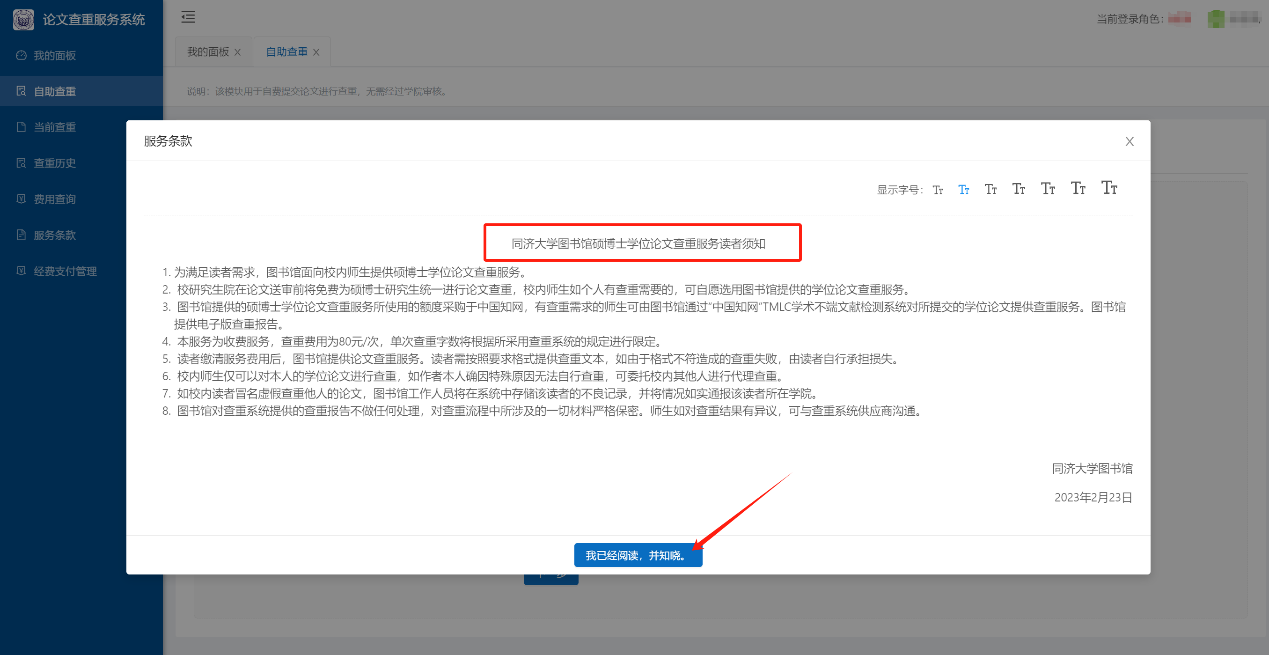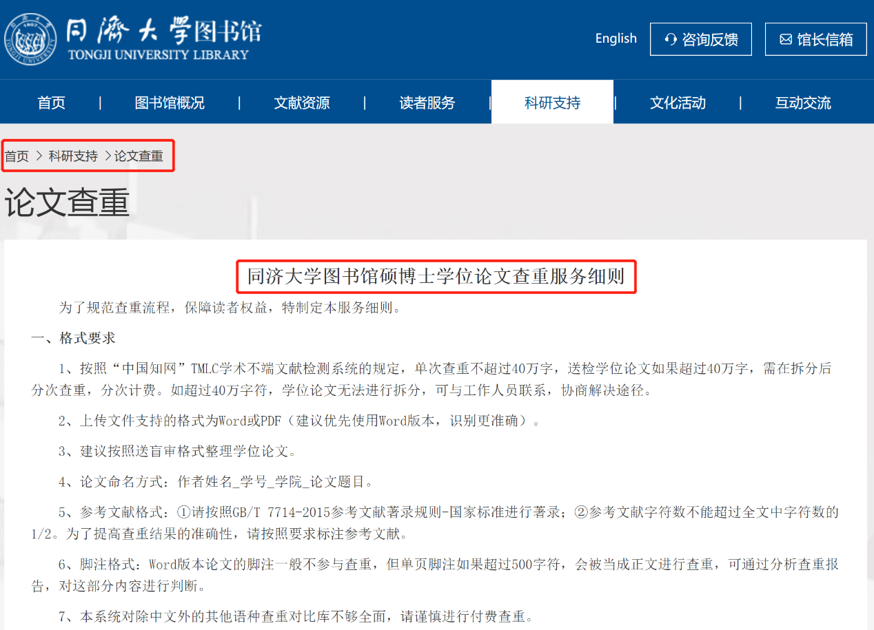 (1)进入同济大学图书馆主页,点击【科研支持】——【论文查重】,阅读查重服务细则;
