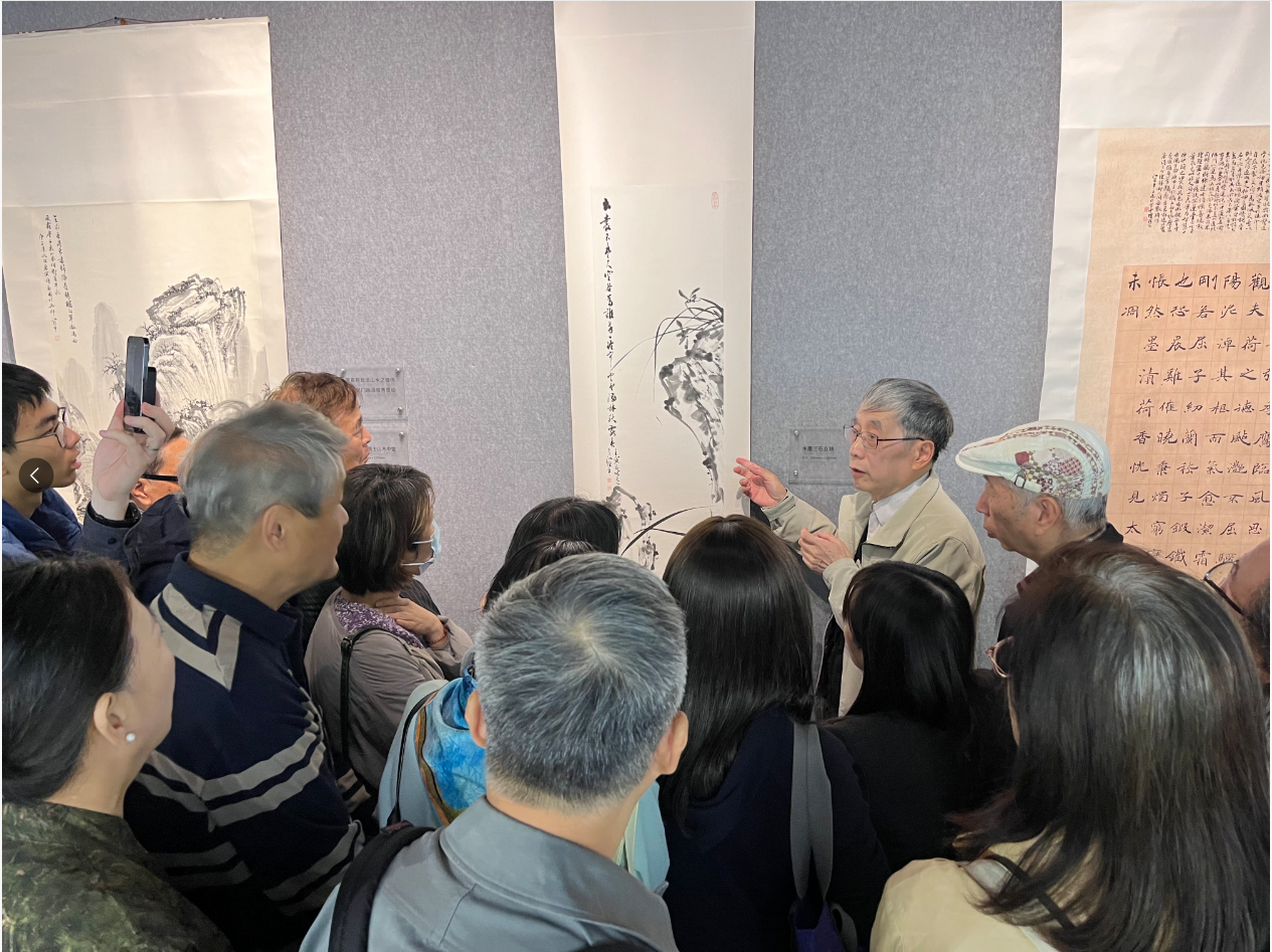 理论阐述完毕,江先生带领师生们移步博物馆一楼展厅,结合“千帆隐映 静水流深——江理平书画艺术于教育实践展”中的国画展品进行讲解与互动。面对亲笔画作,他将前述理论具象化,使在场师生和书画爱好者们对笔墨、构图、气韵有了更真切的感知。