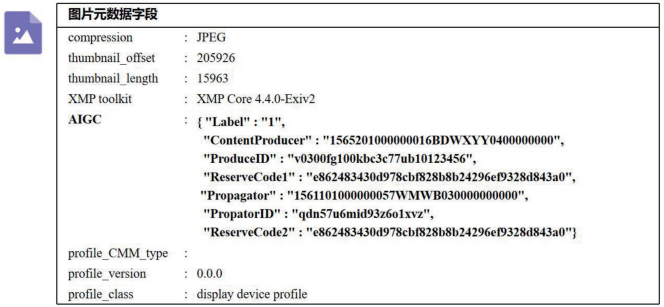 (图源:《网络安全技术--人工智能生成合成内容标识方法》(GB45438-2025)) 隐式标识:采取技术措施在人工智能生成合成内容文件数据中添加的,不易被用户明显感知到的标识。 内容隐式标识是在人工智能生成合成内容数据中添加的数字水印等形式的隐式标识,在本文件中不做要求。 文件元数据隐式标识在人工智能生成合成内容文件元数据中添加的隐式标识。