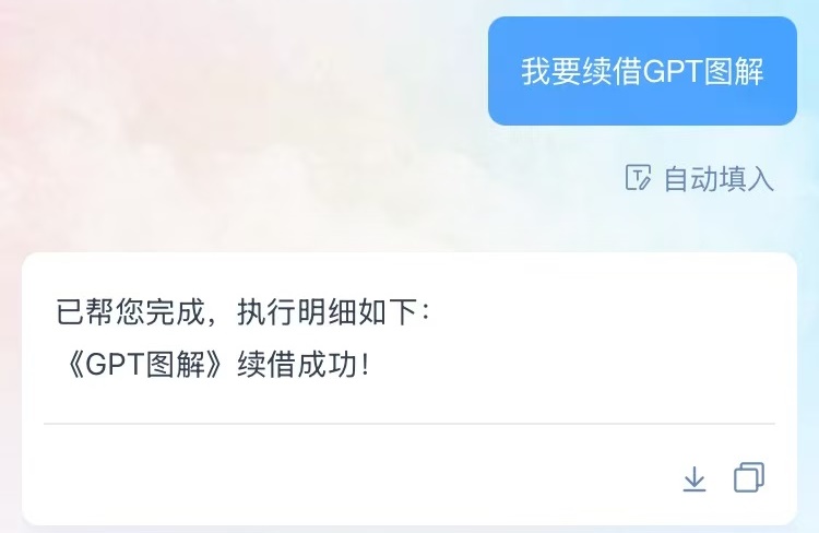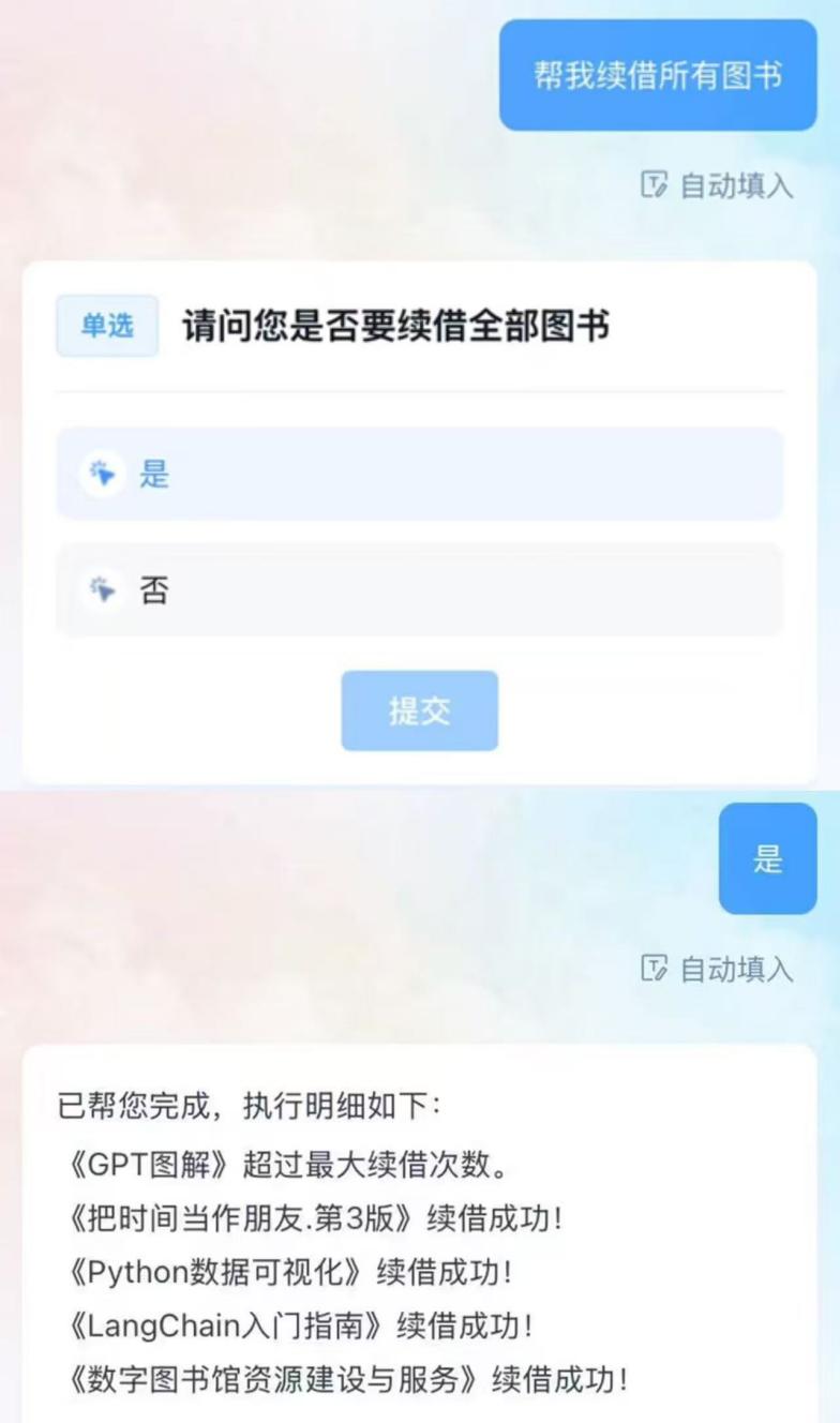 除了在手机或自助借还书机续借外,现在您可以直接向济小图发送指令,即可在线完成图书单本或批量续借,让好书陪伴更久。温馨提示:图书到期前10天可以续借,若该书被预约、读者存在超期书籍,则无法续借。