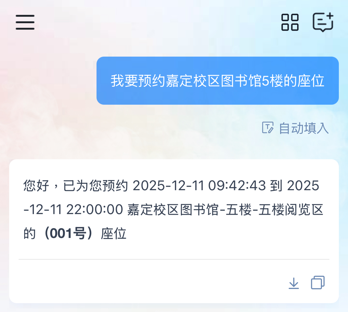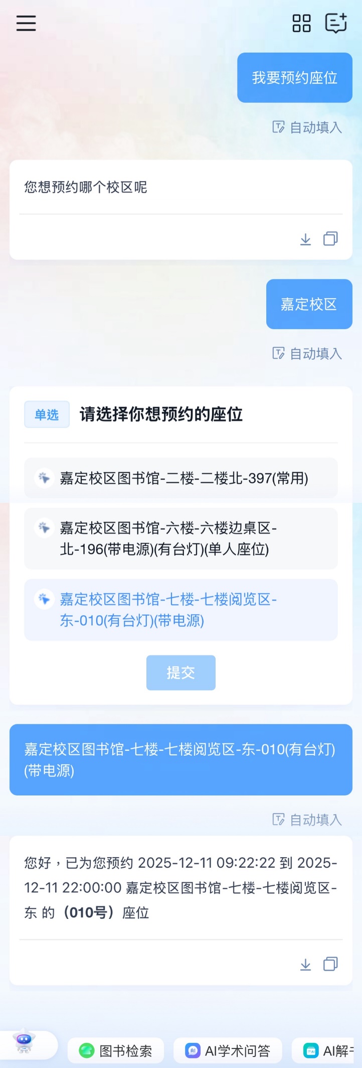 “我要预约xx校区图书馆x楼座位”,系统将立即为您锁定该区域当前座位。精准到座,省时省力,学习计划更从容。