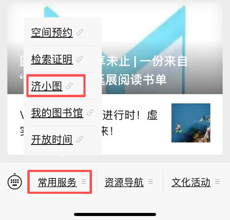 关注“同济大学图书馆”微信公众号,点击菜单“常用服务”-“济小图”,即可开始对话。
