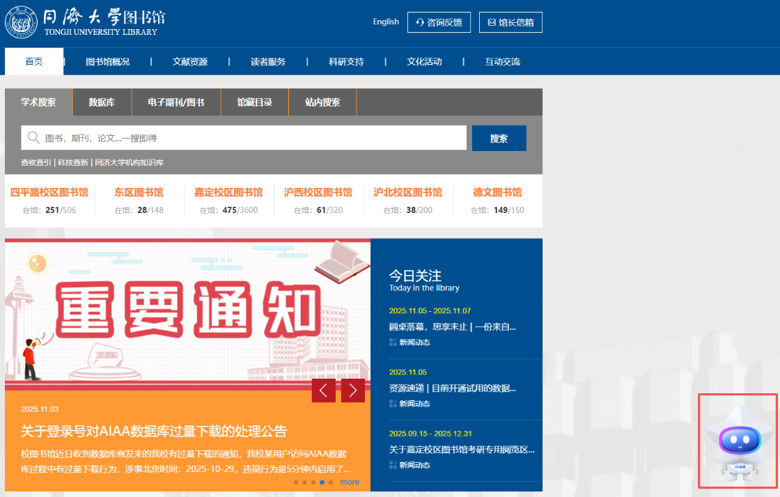 访问同济大学图书馆主页:https://www.lib.tongji.edu.cn/,点击右下角数字人,开启AI服务之旅。