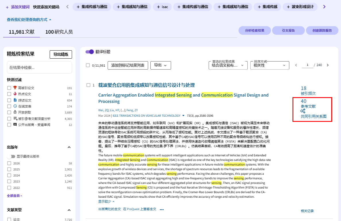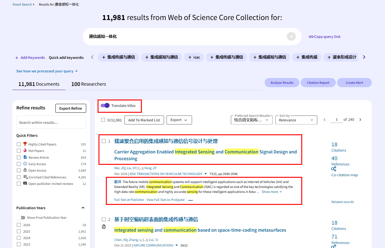 智能检索功能可以利用自然语言处理、语义搜索、WOS知识图谱、人工智能驱动的上下文感知预输入和翻译来提供无缝和个性化的搜索体验,用户无需构建检索式,可以直接使用中文进行外文文献的检索,同时可以将文献标题和摘要直接翻译成中文。