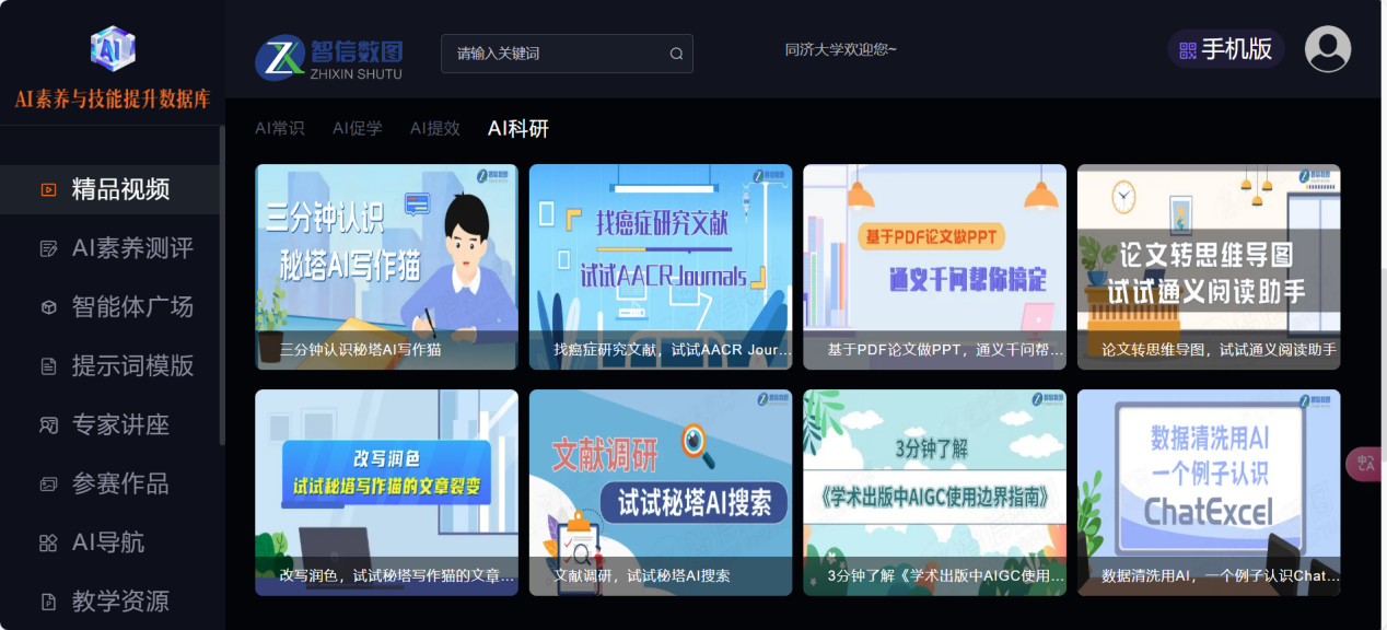 还想掌握更多AI工具?快来解锁图书馆「AI素养与技能提升数据库」!该数据库涵盖了AI常识、AI促学、AI提效、AI科研等七大模块,以微视频的形式输出,通过2~4分钟讲述一个知识点,言简意赅,干货满满,助你全方位提升AI应用能力!