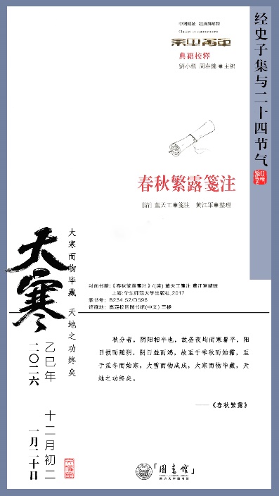 大寒日,上海迎来寒潮风雨雪,恰是“大寒而物毕藏”的时节。对进入寒假的师生而言,这段蛰居时光正适合涵养精神。最后一期专栏给大家推荐《春秋繁露》,在古人“观天察时”的智慧中,体味岁末收敛中蕴含的新生力量。