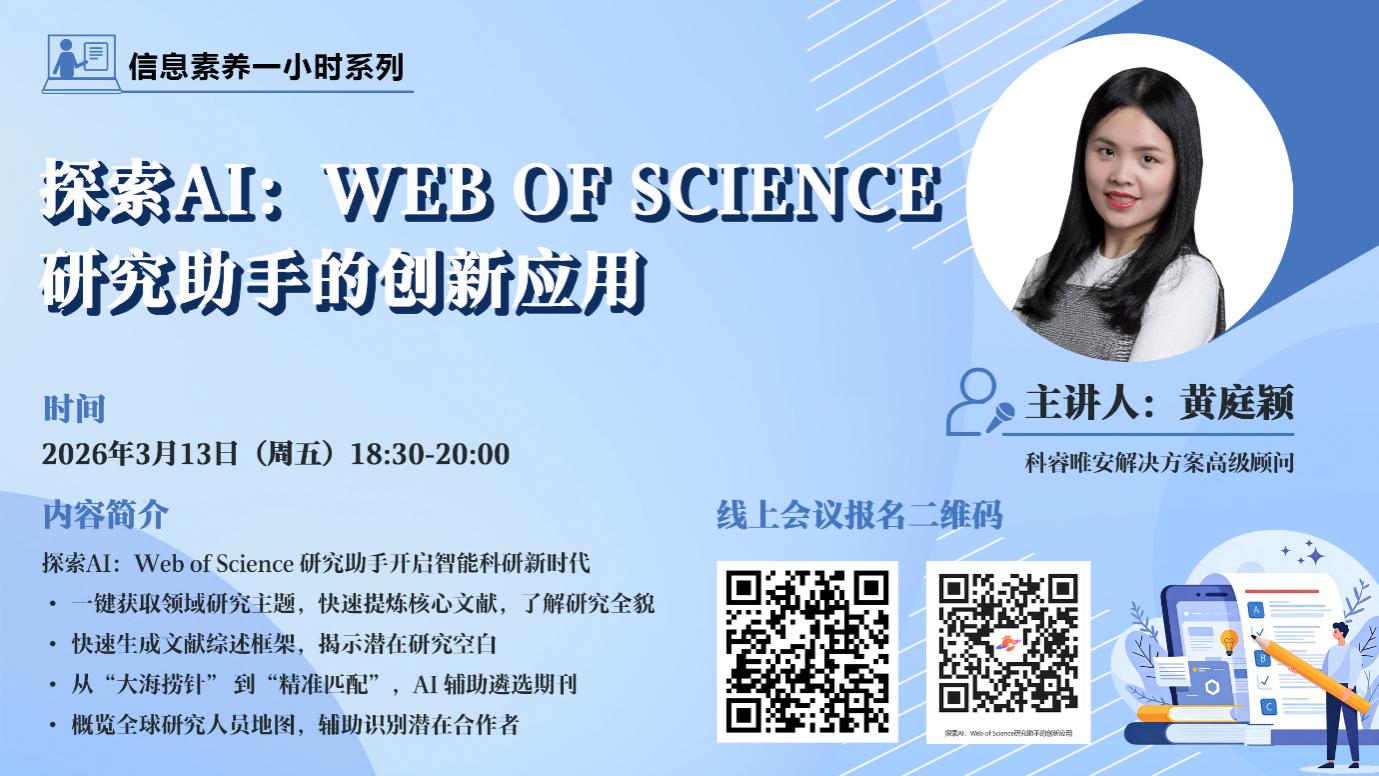 - Web of Science官方AI工具——Web of Science Research Assistant现已开通试用!同济大学图书馆携手科睿唯安围绕Web of Science研究助手等工具,通过具体案例分享Web of Science官方AI助手在科研工作中的应用,全方位助力本校师生们开展科研选题、文献调研、选刊投稿等科研活动,欢迎大家积极参与试用! 讲座提纲: ...