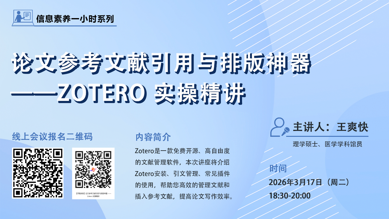 - 写论文的你,是不是还在被这些问题困扰? 手动整理几十篇文献费时费力 投稿时因参考文献格式不符反复调整…… 别让文献管理拖延你的科研效率——开源神器Zotero,正是你需要的“文献管家”! Zotero——这款免费、开源的文献管理神器,助你轻松搞定文献分类、PDF管理、引文插入等,一键搭建个人专属文献库,更有海量插件拓展无限可能! 本次讲座,医学图书馆学科馆员...