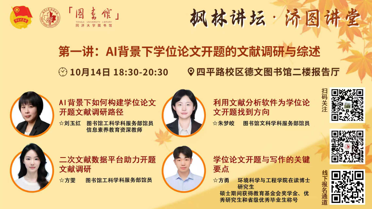 - 金秋如约,开题启航! 亲爱的同学们 你是否正在为学术论文的选题而反复推敲? 你是否在面对浩如烟海的文献时略感彷徨? 你是否为纷繁复杂的文献工具而踌躇不前? 你是否渴望探索AI助力传统方法融合之道? 别划走! “枫林讲坛·济图讲堂”带你一站式解决! 四项核心攻略 带你玩转智能科研 让你的论文开题快人一步、稳操胜券! ...