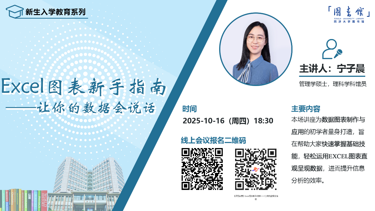 - 数据繁杂,如何一目了然? 图表制作,为何总遇难关? 成果初现,怎样画龙点睛? 本场讲座专为初学者量身打造,帮助大家快速掌握Excel图表核心技巧,高效完成数据呈现,为学习汇报与科研分析提供助力! 讲座时间:2025-10-16(周四)18:30-19:30 讲座地点:线上腾讯会议(会议号:933647332,密码:报名后可见) 主讲人:宁子晨(管理学硕士,理科学科馆...