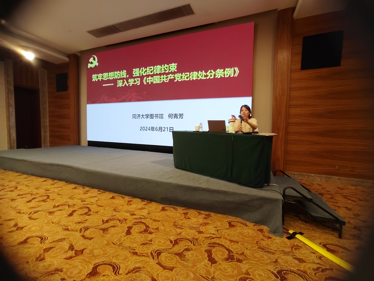 6月21日,图书馆教工第一党支部、四平路派出所党总支、四平社区卫生服务中心党支部以及上海迪顺酒店管理有限公司党支部在同济君禧酒店报告厅共同举办了一场联组学习活动。此次活动特邀图书馆党委副书记、纪委书记何青芳担任主讲,带领党员们进一步深入学习《中国共产党纪律处分条例》。 何青芳副书记深刻阐述了习近平总书记关于党的纪律建设的重要论述,全面回顾了中国共产党纪律建设的百年历程,并详细介绍了2023版《中国共产党纪律处分条例》的重点修改内容。随后,她分享了自己的学习体会,强调要深刻领会开展党纪学习教育的重要意义,并明确党纪学习的重点所在。她特别指出,在学习《条例》的过程中,必须将其与学习习近平新时代中国特色社会主义思想紧密结合,同时也要与学习党章及其他党内法规、学习宪法及其他法律法规有机结合起来,形成全面系统的学习体系。她着重强调,每位党员都应牢固树立党纪意识,自觉增强学纪、遵纪、守纪的主动性和自觉性,做到内化于心、外化于行。