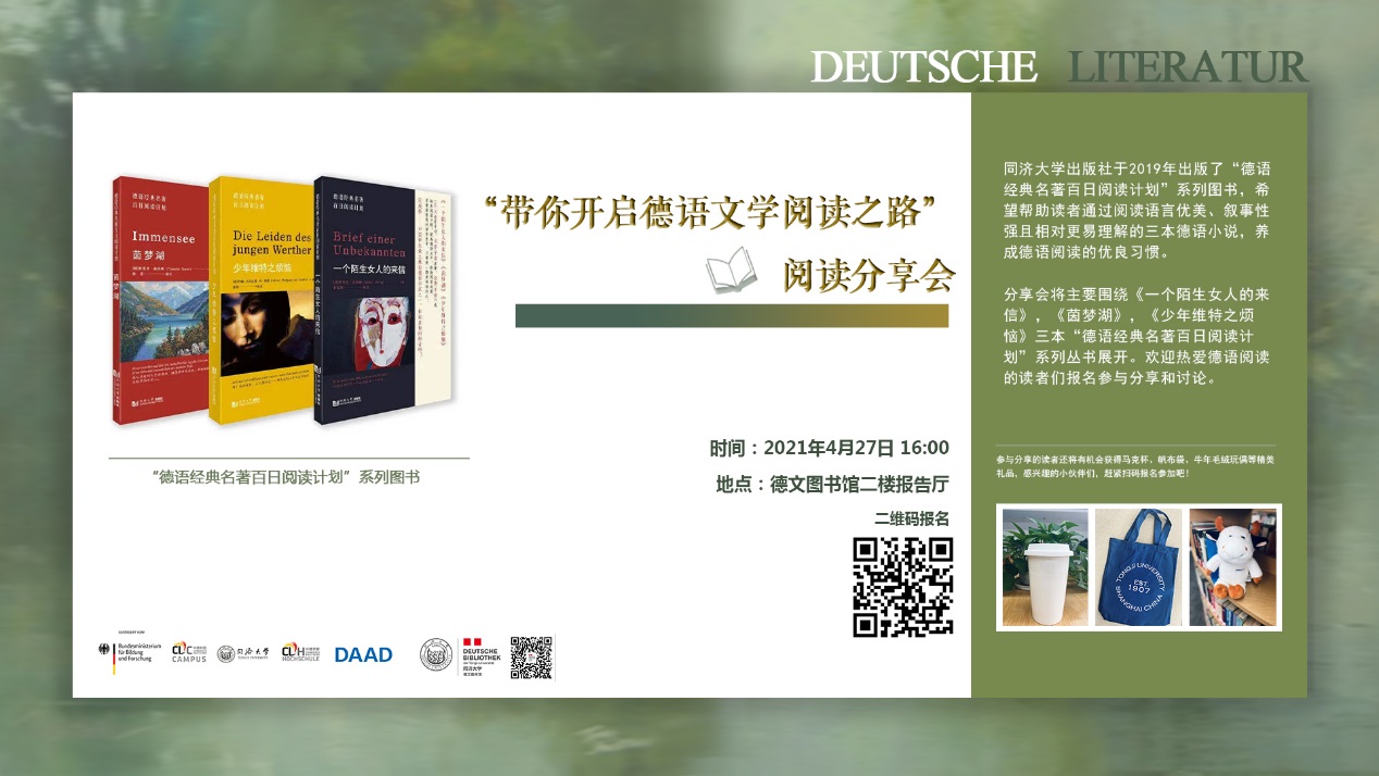 - Am 13. April startete am Nachmittag im Hörsaal der Deutschen Bibliothek die „Reise in die deutsche Literatur“ mit Frau Prof. HUANG Keqin, Professorin für deutsche Sprache und Literatur an der Tongji-Universität, und Frau SUN Liyan, stellvertretende Redakteurin für...